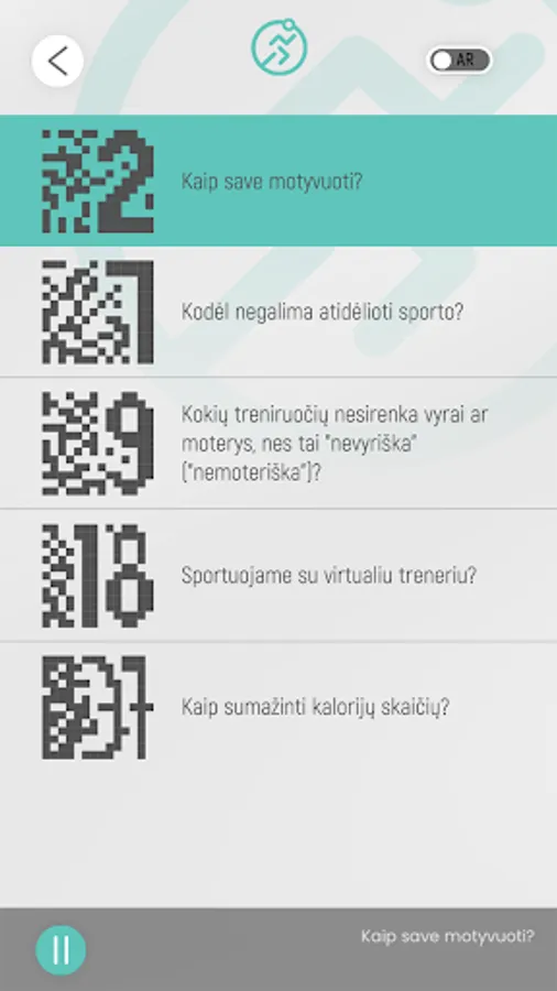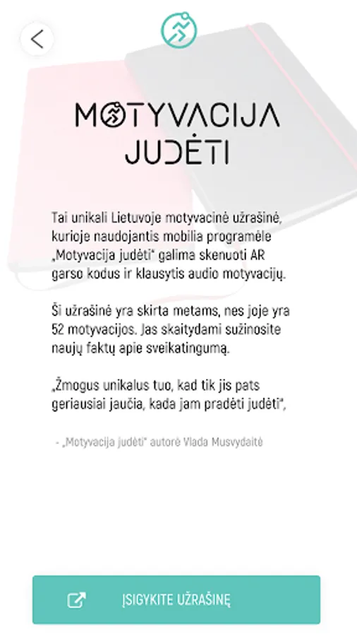 The mobile app Motyvacija judėti ("Motivation to move") is intended to complement the motivation book-notebook Motyvacija judėti, completely new in Lithuania. Scan Motyvacija judėti and see for yourself! Scan the audio AR code and hear the motivation you have chosen!