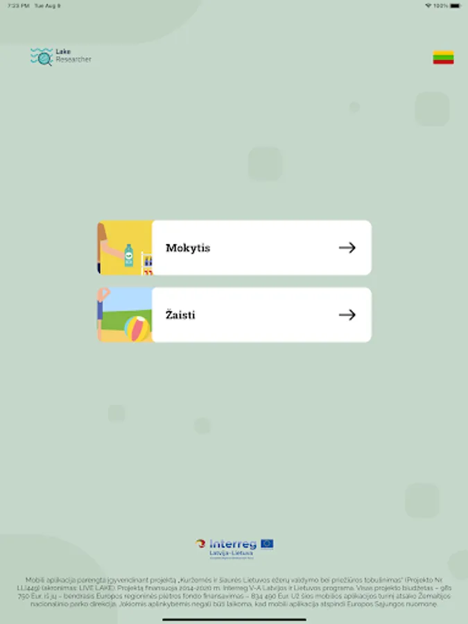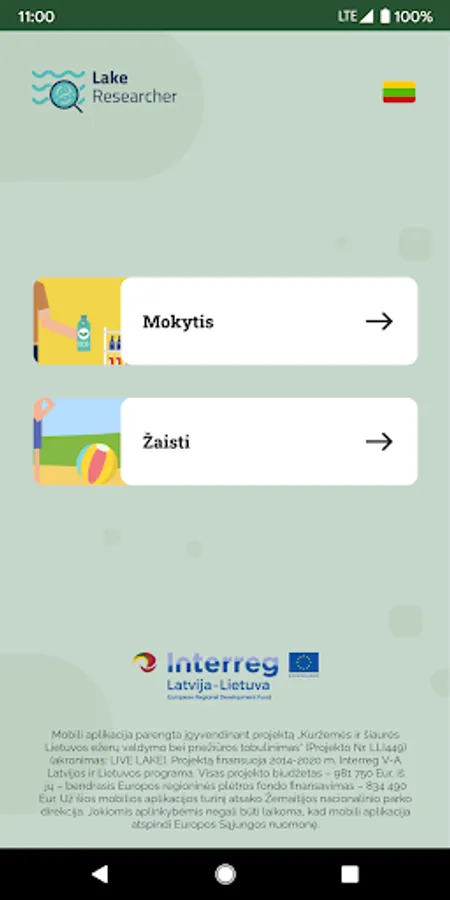 The mobile application was developed during the implementation of the project "Improving the management and maintenance of the lakes of Kurzeme and Northern Lithuania" (Project no. LLI449) (acronym: LIVE LAKE). The project is financed in 2014-2020. Interreg V-A program of Latvia and Lithuania. The entire project budget is EUR 981,750, of which the general financing of the European Regional Development Fund is EUR 834,490. The management of the Žemaitija National Park is responsible for the content of this mobile application. Under no circumstances can the mobile application be considered to reflect the opinion of the European Union.