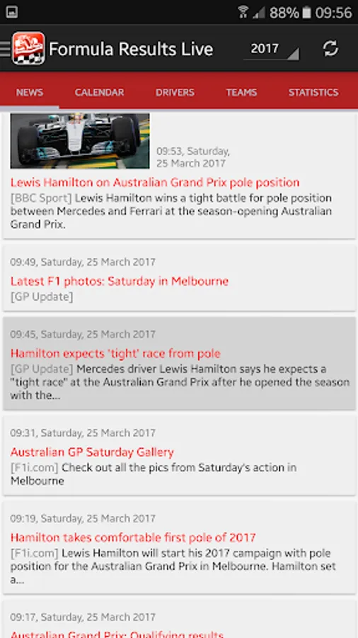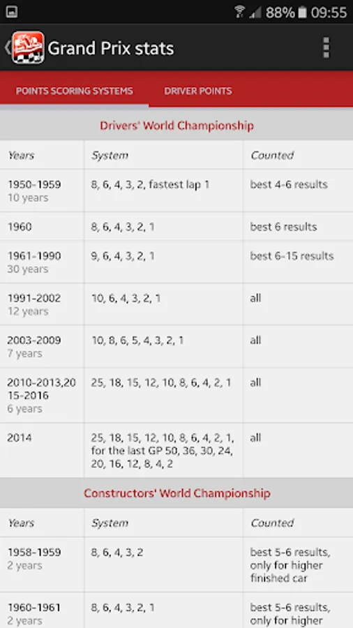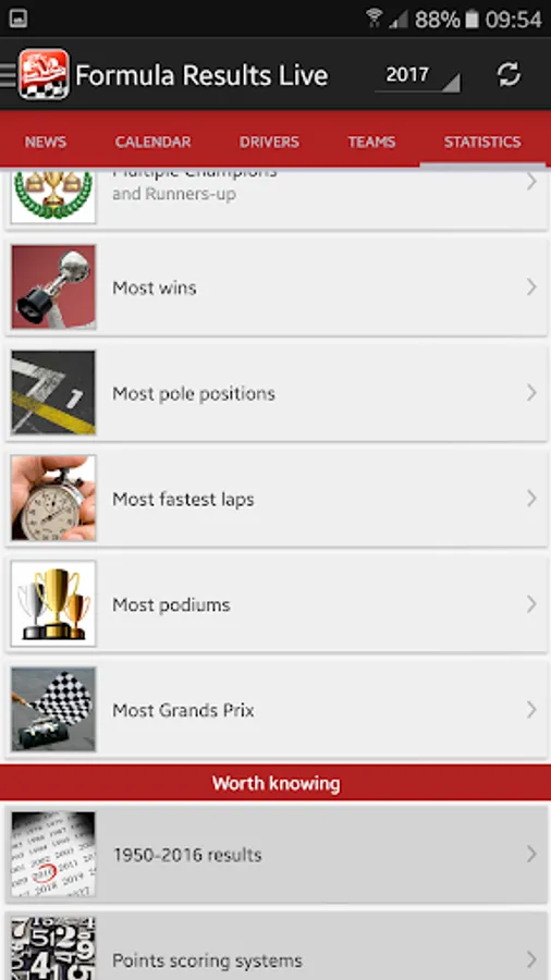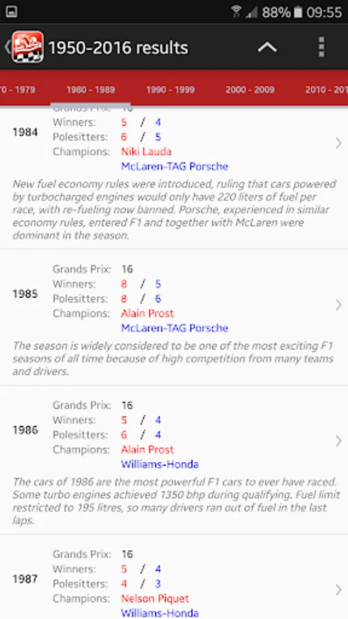Formula History Results is app for all F1 fans. Follow results of 2023 season races, compare them with previous winners, times, etc. You'll find here latest news, all 1950-2022 database, team-mate comparison and many illustrated, user friendly, interesting statistics.
