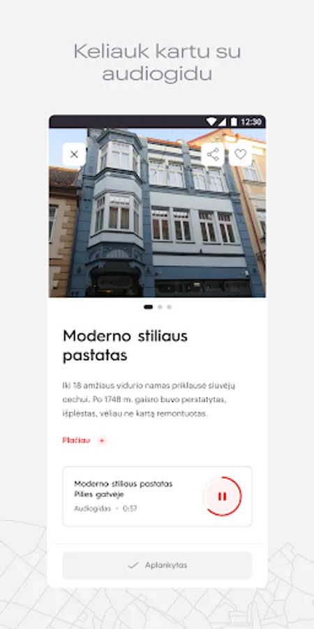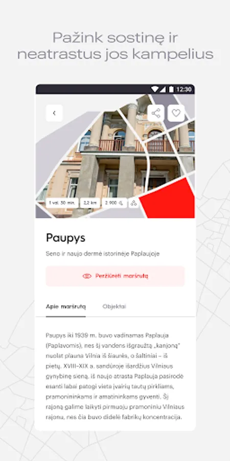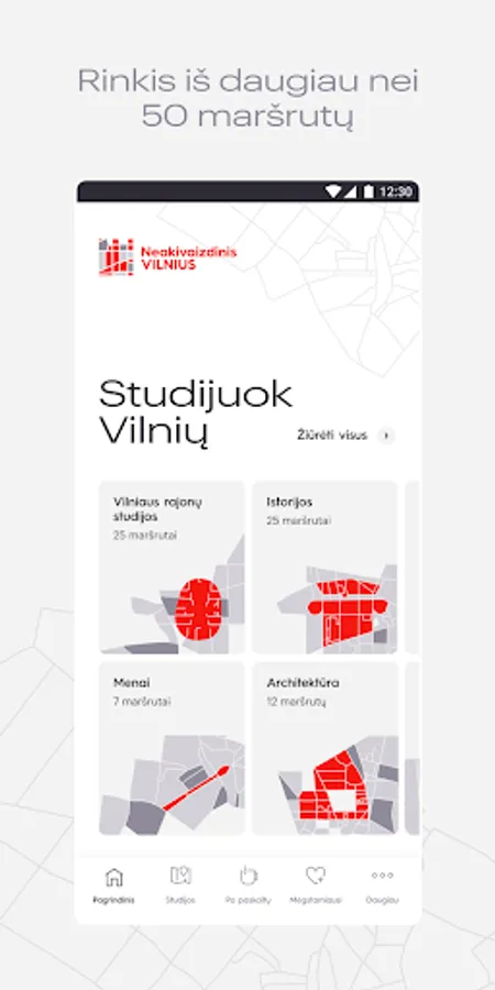Discover Vilnius via „Neakivaizdinis Vilnius“ app*! Choose from more than 50 different routes, study Vilnius through history, architecture, nature, literature, arts and other topics. The app offers audio-guides, you can save your favourite places and find information about cozy cafes, art and cultural spaces near the routes.