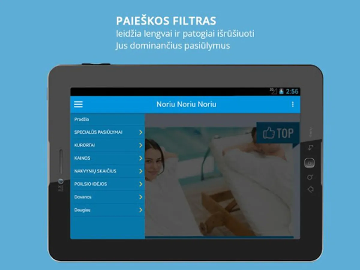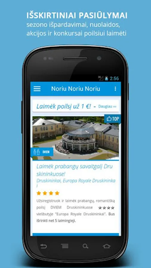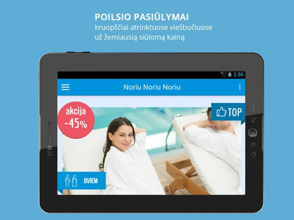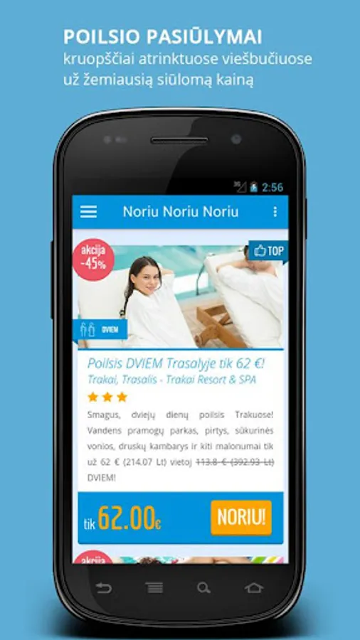 Su ,,NoriuNoriuNoriu” programėle poilsio kelialapį įsigysite greičiau bei daug paprasčiau. Vos keli išmaniojo telefono paspaudimai ir telefono programėlė jau bus įdiegta jūsų telefone. Programėlė yra patogi tuo, jog leidžia čia ir dabar rasti bei įsigyti norimą poilsio kelialapį neeikvojant jūsų brangaus laiko. Nesvarbu ar važiuojate iš darbo namo, stovite kamštyje, o gal vakarieniaujate restorane, poilsis dabar tampa ranka pasiekiamas.