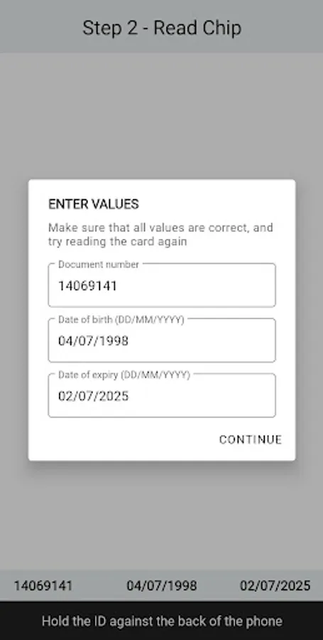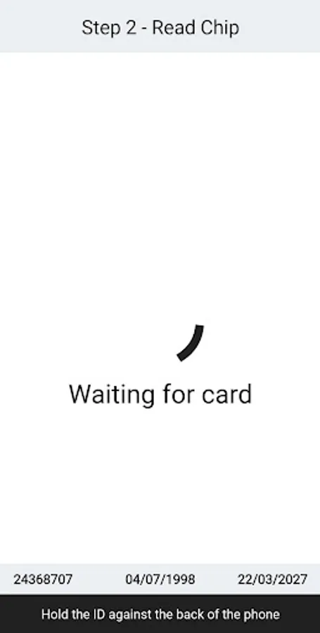 The app performs optical character recognition (OCR) on Machine Readable Zone (MRZ) to gain access to the chip. Using NFC it reads data that is stored in the chip. After reading the chip face image is captured. Both captured image and image from the chip are displayed with the matching result and additional data that was found in chip.