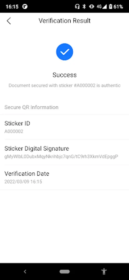 - Check the authenticity of a document by scanning and decoding the QR code of the secure sticker using a mobile phone.