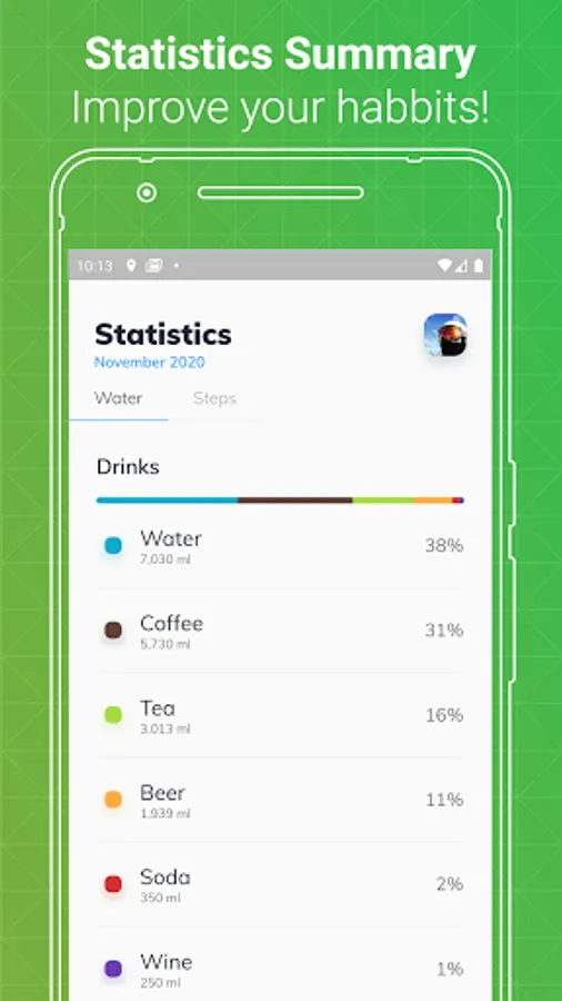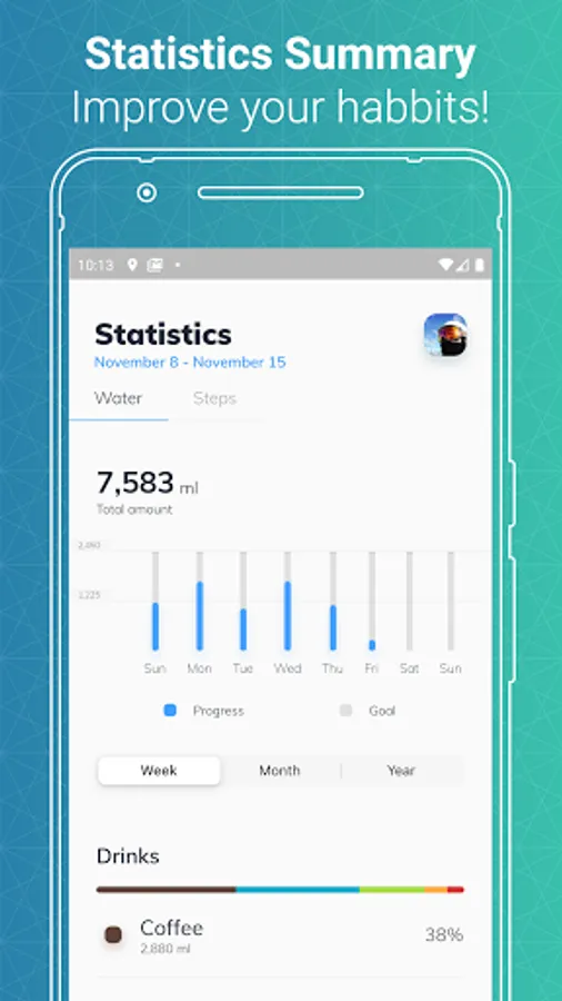 • Set your daily goals, customize them and cup by cup, step by step reach them all.