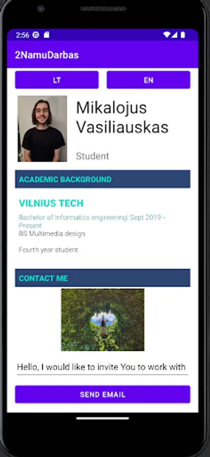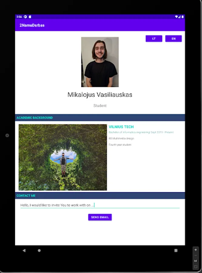 This app contains a CV - basic information about Mikaloj. Through this app, you can contact Mikalojas Vasiliauskas directly and propose cooperation ideas.