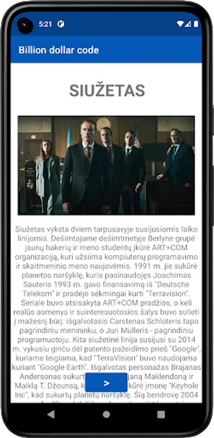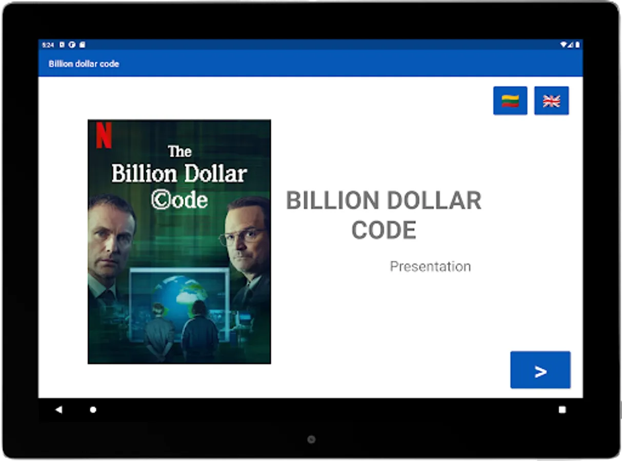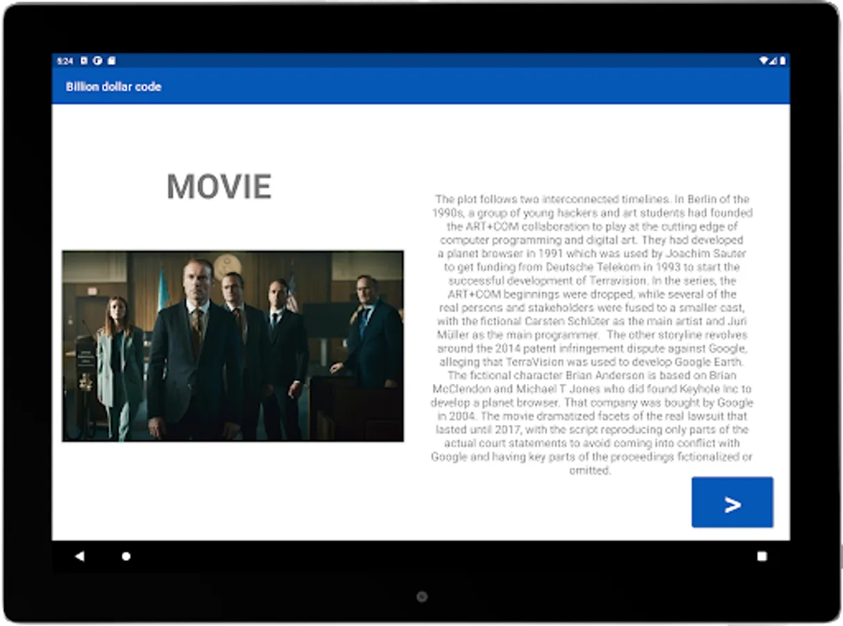 In this app you will find a presentation about a movie called "Billion Dollar Code". Information sections include plot, cast, short video, and reviews section.