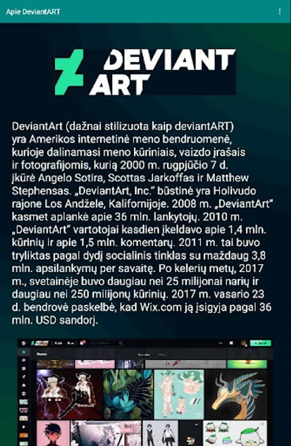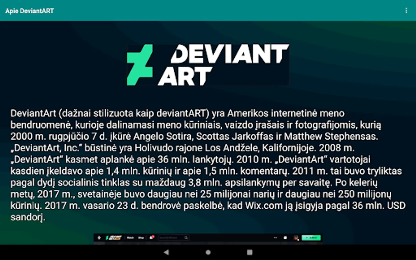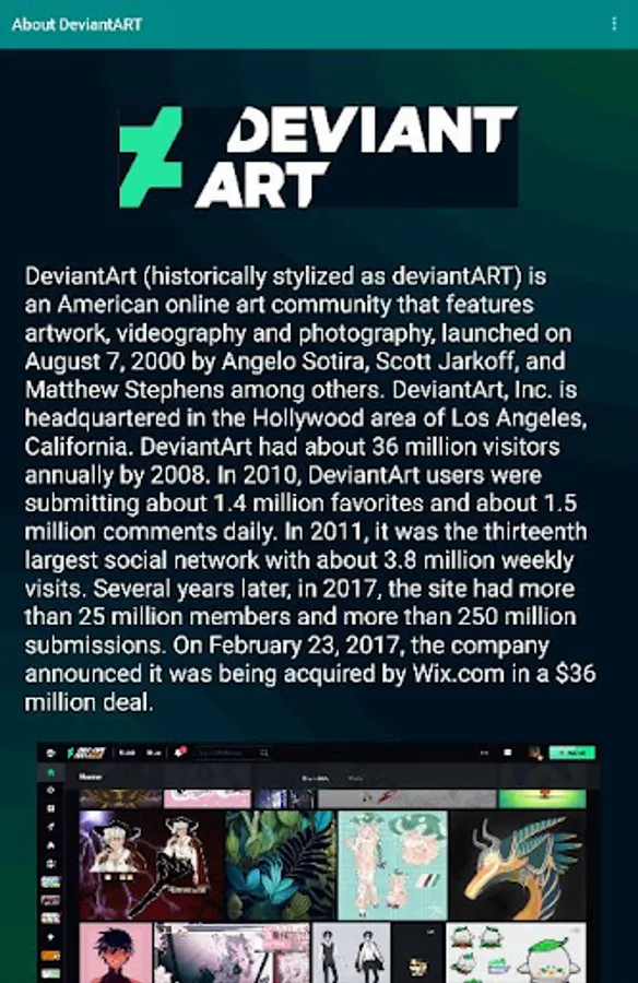 This app provides a brief introduction to DeviantART, a website dedicated to the art community.