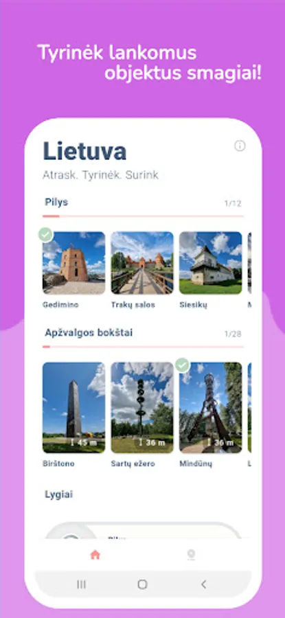 From now on it will be even more fun to visit Lithuania! Collect your collection of visited objects, unlock new levels and achievements.