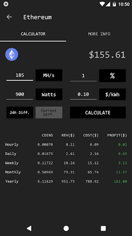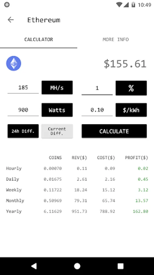 Application calculates cryptocoin reward, cost and profit for entered hashrate, pool fee, power consumption and power cost. Also there is a tab with basic information for selected cryptocoin.