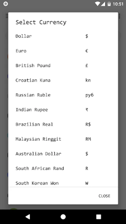 Dollar, Euro, British Pound, Croatian Kuna, Russian Ruble, Indian Rupee, Brazilian Real, Malaysian Ringgit, Australian Dollar, South African Rand, South Korean Won, Canadian Dollar, Japanese Yen, Mexican Peso