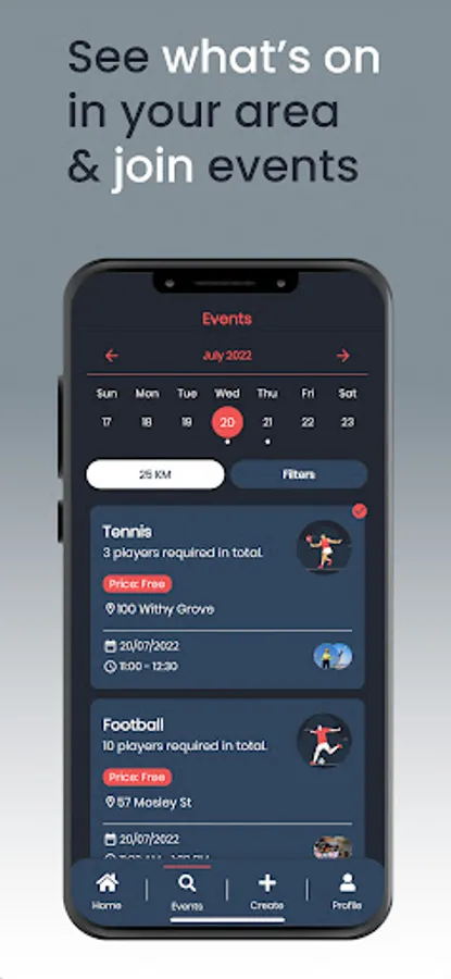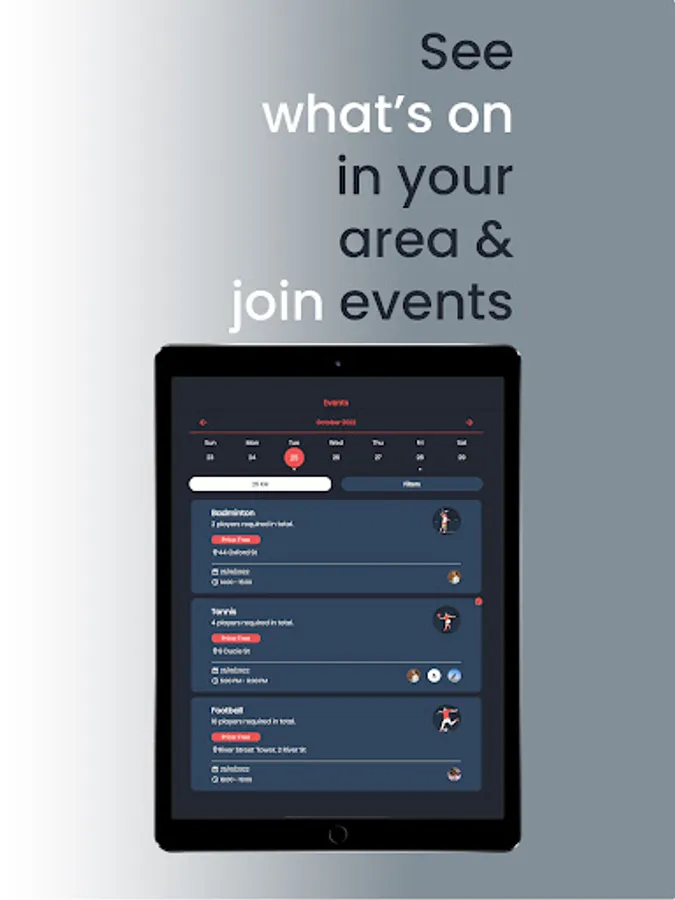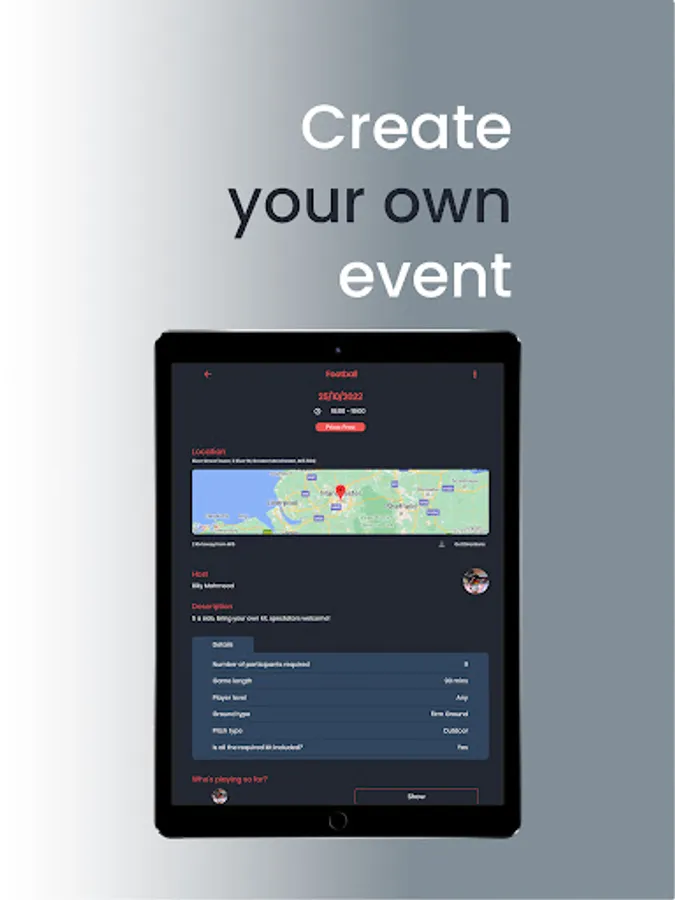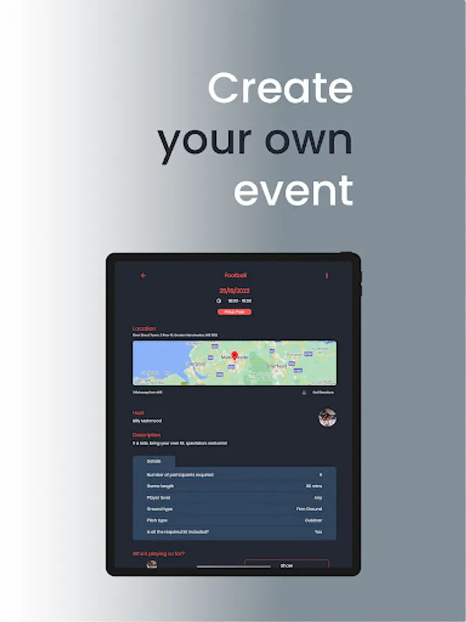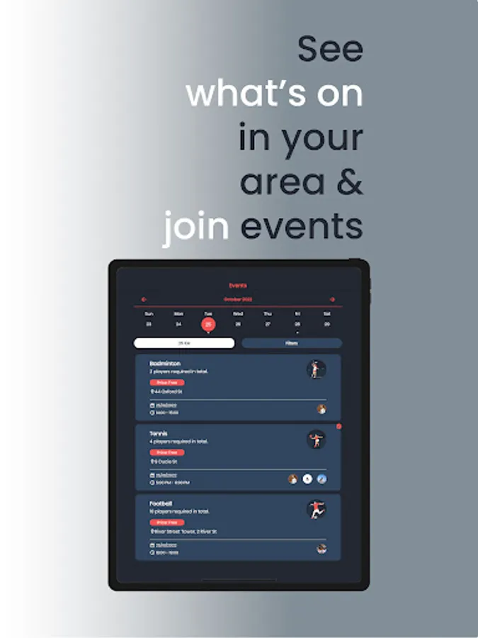 Fancy managing a team or hosting your own event? This is the perfect App to organise it all, from finding players, taking payments and managing the event, you can take the lead in building your own local sporting community.