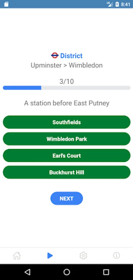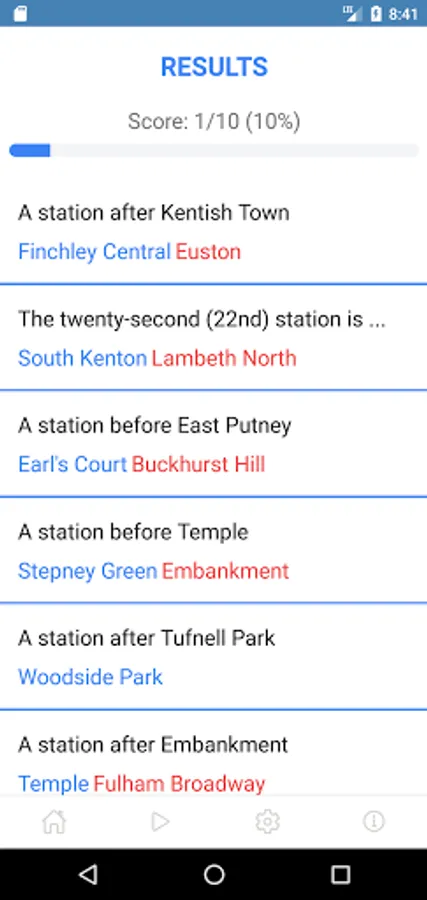 Ten multiple-choice questions are presented one by one. A question is about a single line and the direction of travel or all lines. Four options are presented to the user and only one answer is correct. At the end, all the questions and correct answers are displayed with the score.