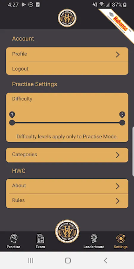 The application includes to modes, a practise mode where the user will get immediate results on his answers, eliminating the wrong ones and a test mode which will simulate the real HWC knowledge test without any feedback.
