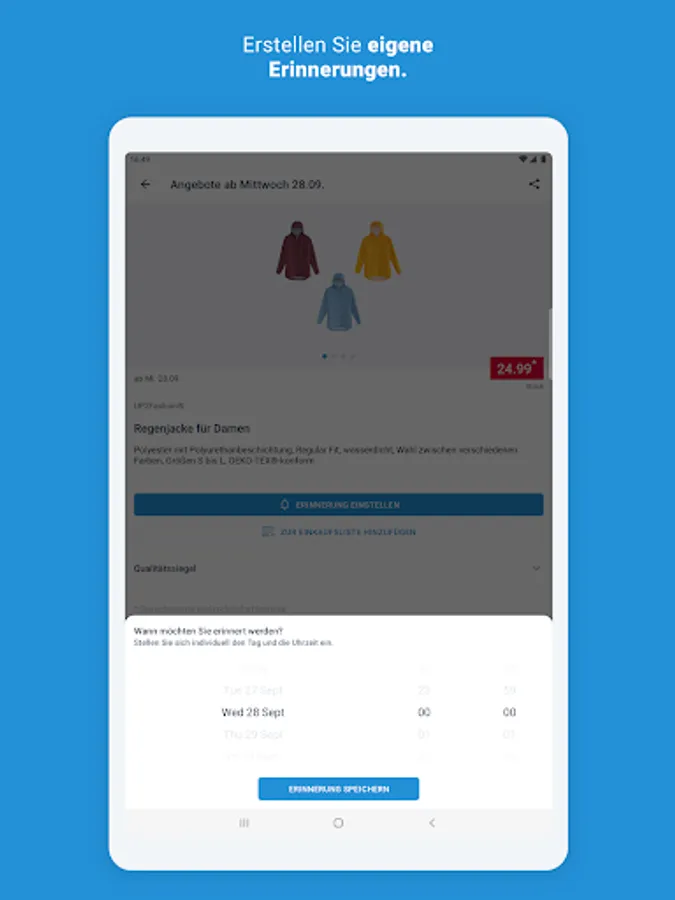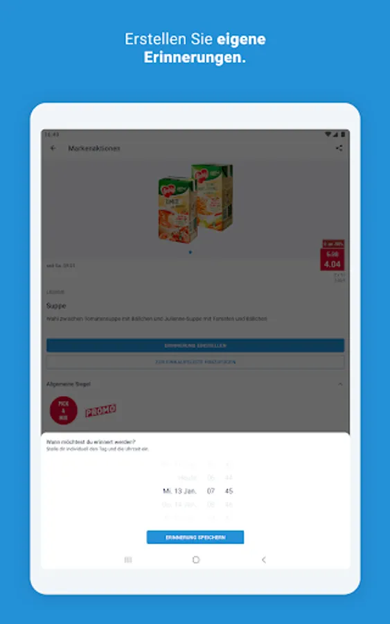 Did you miss a great promotion? That would not have happened to you with the ALDI app. You have access to all current offers, sorted by sale date. You can search them, filter them or just get inspired. And if you have found something, simply put it on the shopping list - and the app will automatically remind you when sales start (function can be deactivated if desired). Or you can create a reminder for your desired time, for example on your shopping day.