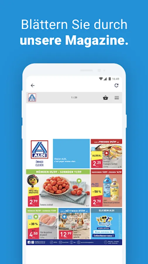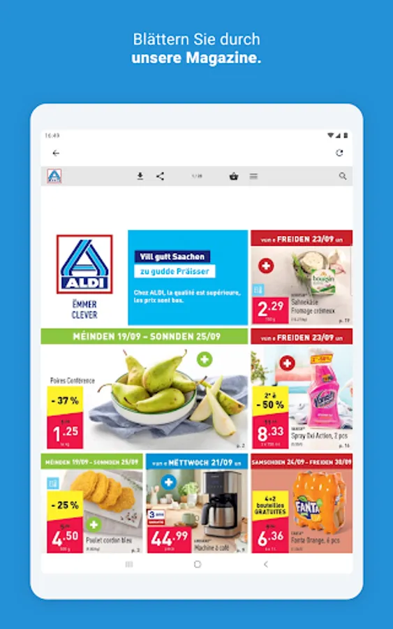 Would you rather look at the offers in the magazine? No problem: In the ALDI app you will find all the current magazines, from the weekly offers to the range of wines. And best of all: Many products are directly linked so that you can easily call up additional images and additional information. And of course you also save a little paper with the digital magazine - and thus protect the environment.