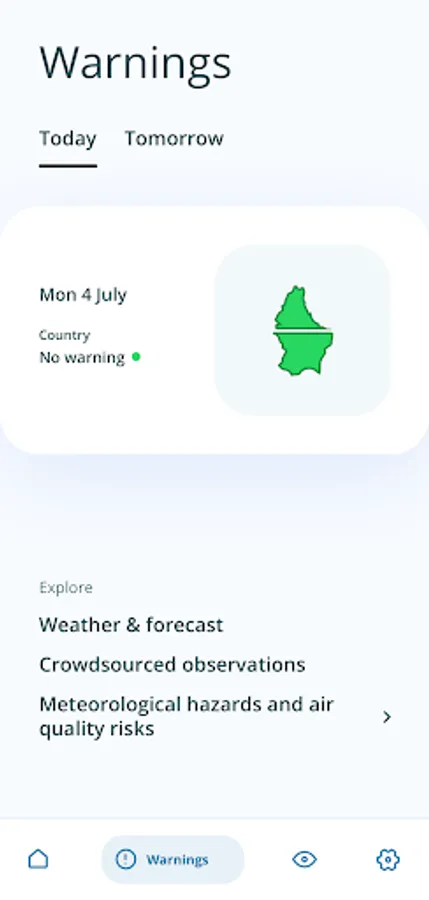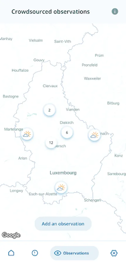 "MeteoLux makes its expertise available in its mobile application to provide detailed information on current and future meteorological conditions in Luxembourg. You will find our short and medium-term forecasts, our weather alerts as well as the observations from our station located at the Airport Luxembourg-Findel over the last 5 days. Features to track weather conditions in near-real time such as radar/satellite animations have also been implemented. You will also have the opportunity to actively participate by making a contribution to the observations within the Greater Region.