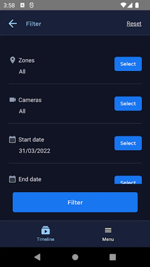 - Filter detections based on camera, zones, and start/end dates.