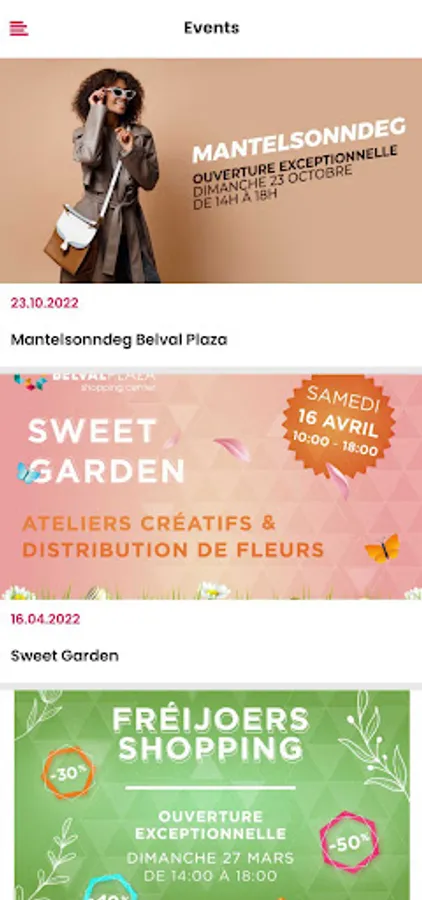 • Keep an eye on the list of services offered by your favorite shopping center making your visit even more pleasant, such as a personal shopper, large car park, ticket machines, etc. Evolving with your needs and desires, the application will be equipped with a variety of exciting new features in the coming months. Feedback is always appreciated, do not hesitate to send us a little email with what you would like to see in your app! See you soon in your Belval Plaza shopping center!