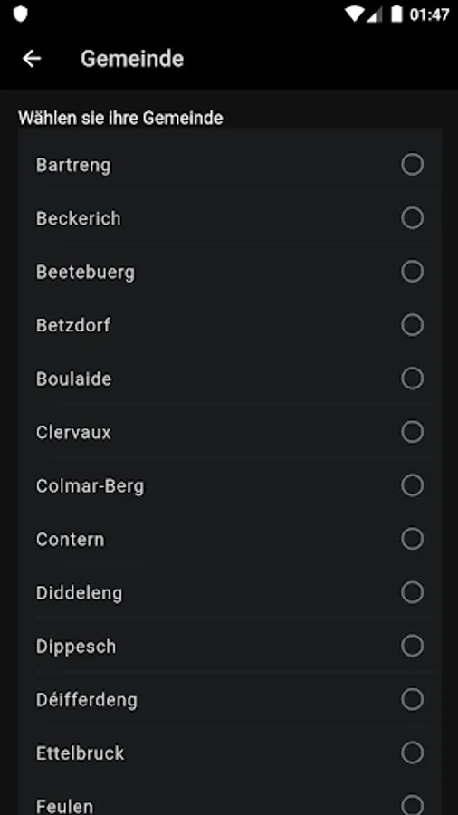 Bascharage, Beaufort, Bech, Beckerich, Berdorf, Bertrange, Bettembourg, Bettendorf, Betzdorf, Bissen, Biwer, Boulaide, Bourscheid, Bous, Clervaux, Colmar-Berg, Consdorf, Contern, Dalheim, Diekirch, Differdange, Dippach, Dudelange, Echternach, Ell, Erpeldange-sur-Sure, Esch/Alzette, Esch-sur-Sure, Ettelbruck, Feulen, Fischbach, Flaxweiler, Frisange, Garnich, Goesdorf, Grevenmacher, Grosbous, Heffingen, Helperknapp, Hesperange, Hobscheid, Junglinster, Kayl, Kehlen, Kiischpelt, Kopstal, Lac Haute Sure, Larochette, Lenningen, Leudelange, Lintgen, Lorentzweiler, Luxembourg, Mamer, Manternach, Mersch, Mertert, Mertzig, Mondorf, Monnerich, Niederanven, Nommern, Parc Hosingen, Petange, Preizerdaul, Putscheid, Rambrouch, Reckange sur Mess, Redange/Attert, Reisdorf, Remich, Roeser, Rosport, Rumelange, Saeul, Sandweiler, Sanem, Schengen, Schieren, Schifflange, Schuttrange, Stadtbredimus, Steinfort, Steinsel, Strassen, Tandel, Troisvierges, Useldange, Vallée de l'Ernz, Vianden, Vichten, Wahl, Waldbillig, Waldbredimus, Walferdange, Weiswampach, Wiltz, Wincrange, Winseler, Wormeldange.