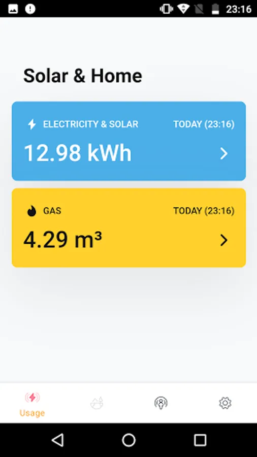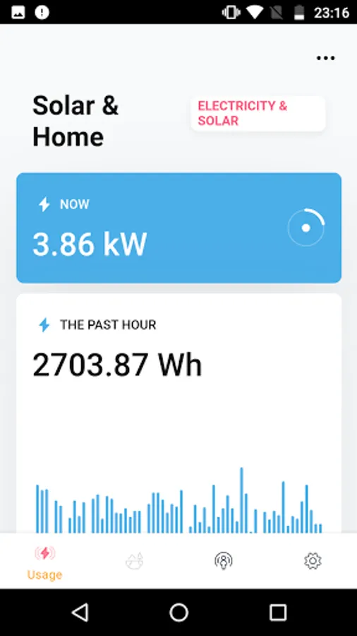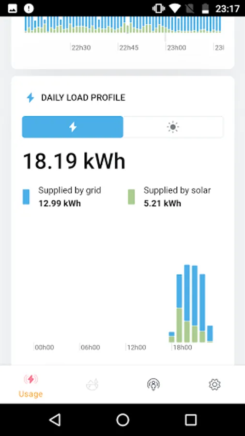 Once your dongle is linked to the Smarty+ app, you can view from your smartphone the instantaneous power (kW) updated every 10 seconds, your consumption during the last hour (Wh) with details per minute as well as your daily consumption (details for each hour (kWh)) and aggregations for longer time intervals. The same information will be available for your renewable energy production, allowing you to overlay it with your consumption.
