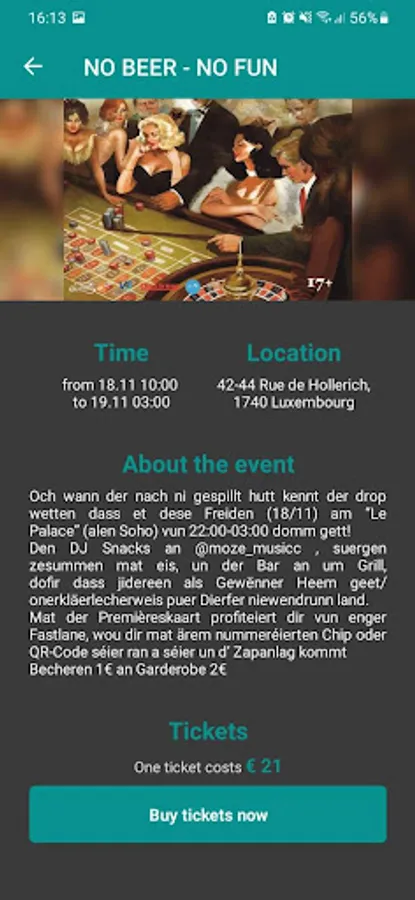 Nightspot helps you find a party near you. It shows you the most relevant parties in and around Luxembourg. After selecting an event, Nightspot redirects you the ticketsale shop.