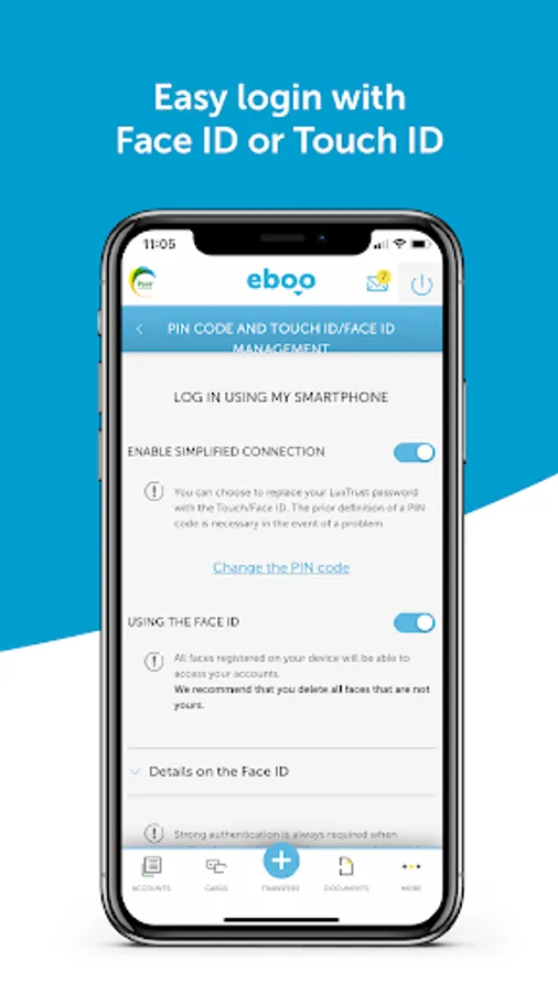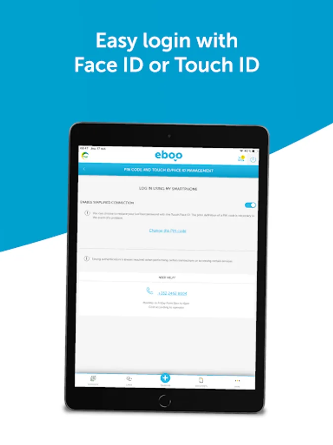 All your accounts and cards in one place, in five languages (LU, FR, DE, EN and PT), secured by LuxTrust access and biometric recognition (Face ID, Touch ID).