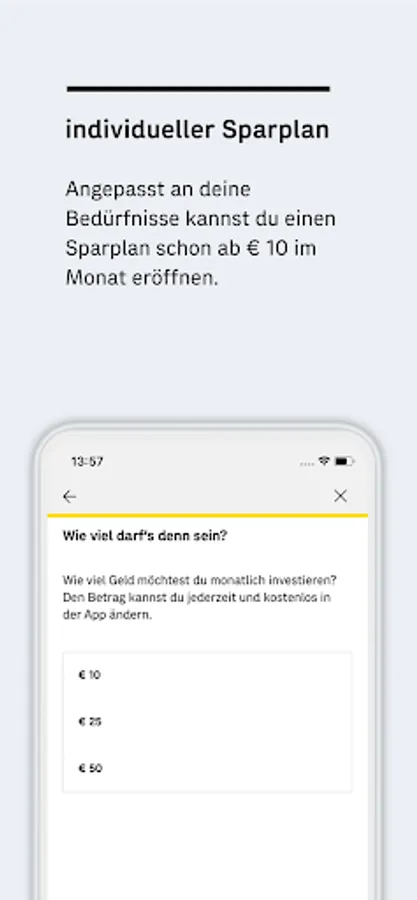Simply choose the amount you want to save monthly or once. And it will automatically be deducted from your account and assessed for you. Depending on your needs, you can open a savings plan for as little as € 10 a month.