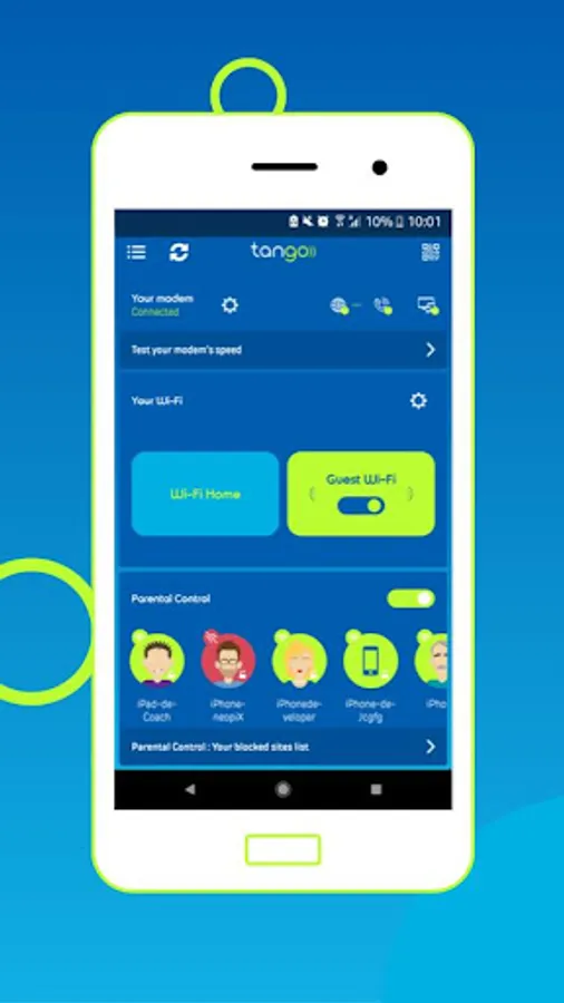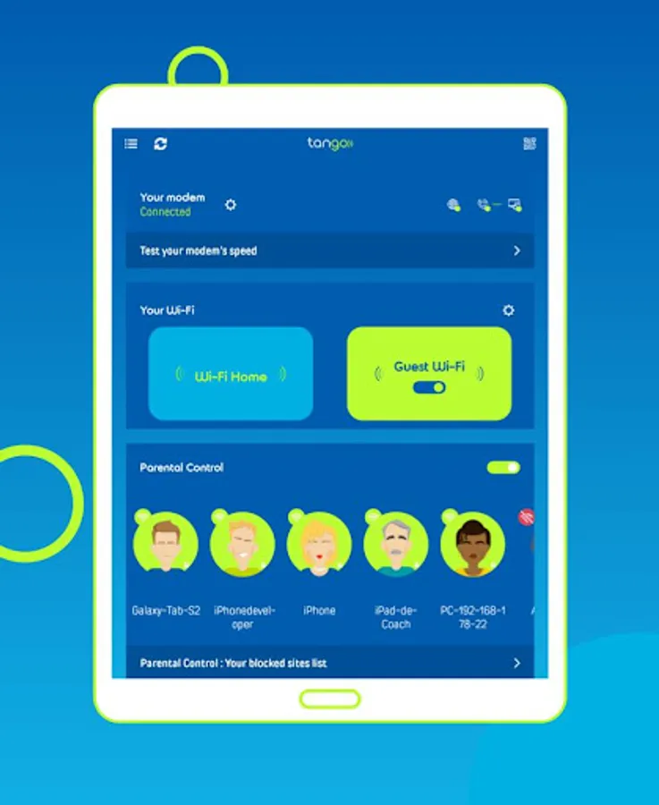 Take things further and control your private and guest Wi-Fi networks, share them or restrict access to them. Once you are connected to your Tango FRITZ!Box, the My Tango Wi-Fi app will allow you to: