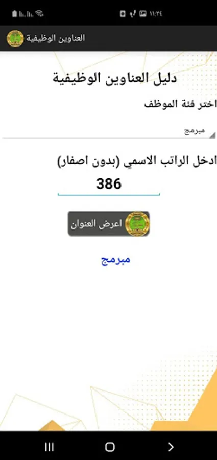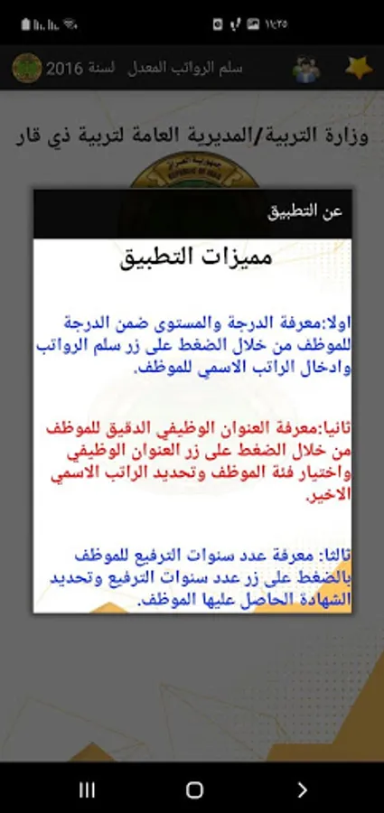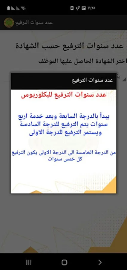 This application saves time and effort for the employees of the Retirement Division, the Bonuses Division, and the Accounts Division in calculating the grade and level of the employee according to the nominal salary, as well as knowing the exact job address of the employee according to the last nominal salary and also displays information on the number of years of promotion according to the employee’s testimony.
