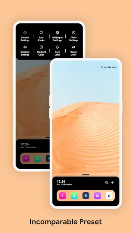 - comes with Custom Wallpaper Maker inside form gradients wallpaper, change colors of each element of UI.