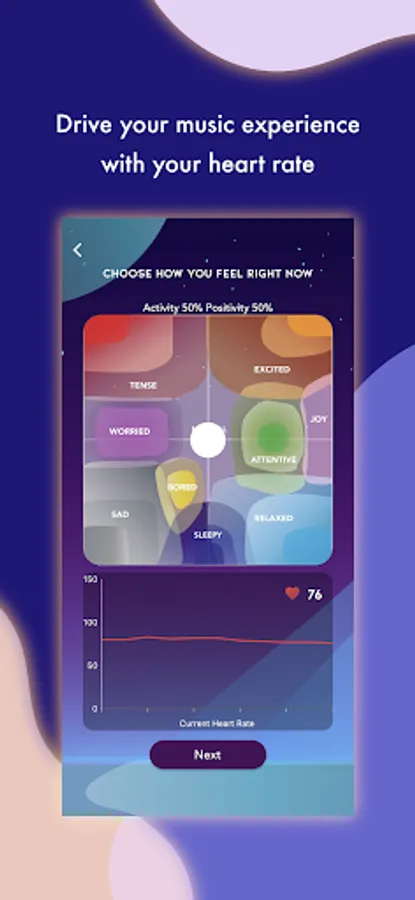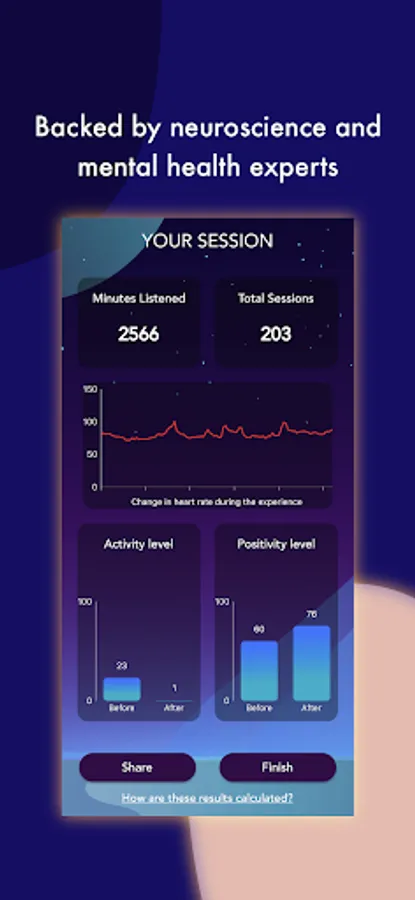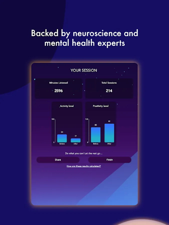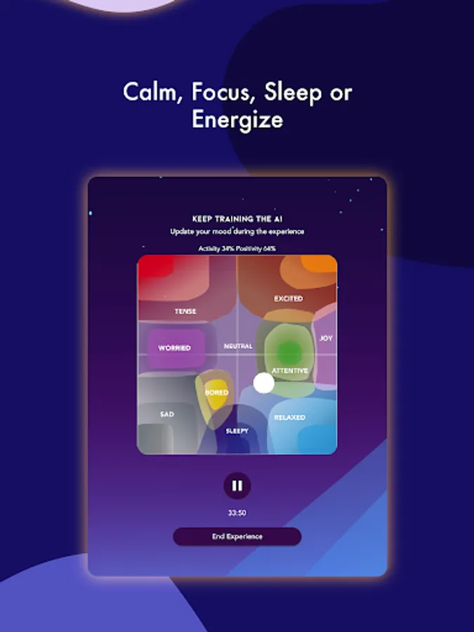 Using an emotional assessment grid, VIBE measures your emotional states before, during, and after the session. This helps to train the AI to better personalize music for your wellness goals. Track the results of your mood-states over-time in our post-session charts. Your personal music companion becomes more personalized with each listen, to help you reach your wellness goals.