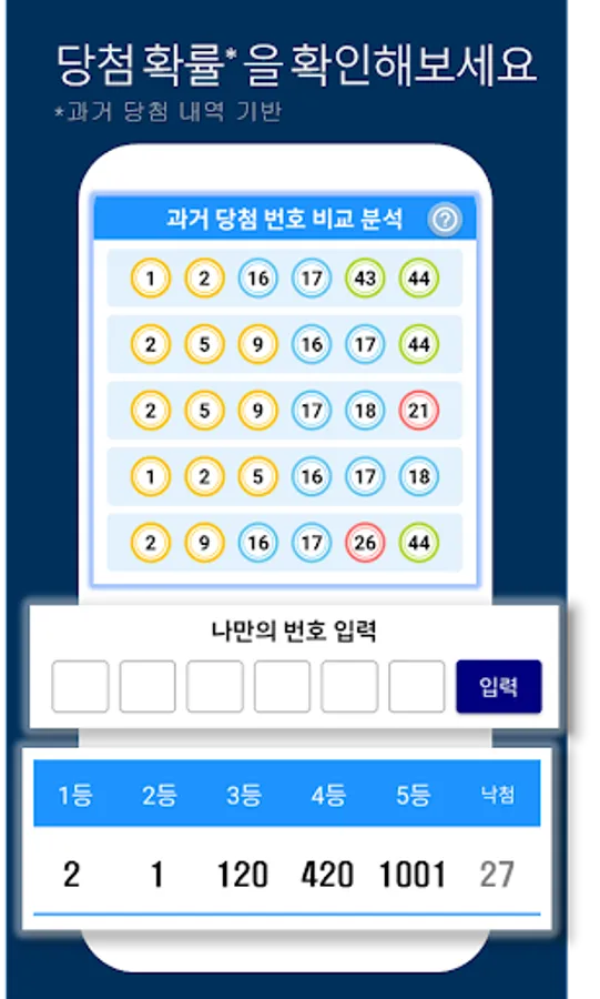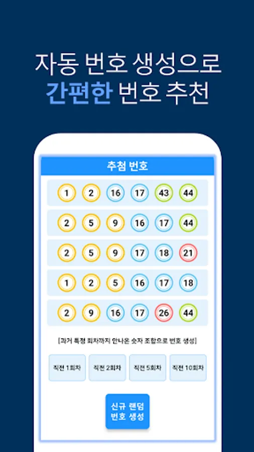 For example, if 5, 12, 18, 27, 32, 40 were drawn in the lottery last week, 'Lucky Lotto Numbers' will not reflect these numbers in this week's recommendation numbers. And 'Lucky Lotto Number' also shows the past winning history of the number you recommended. This will increase your chances of winning the number you recommend.