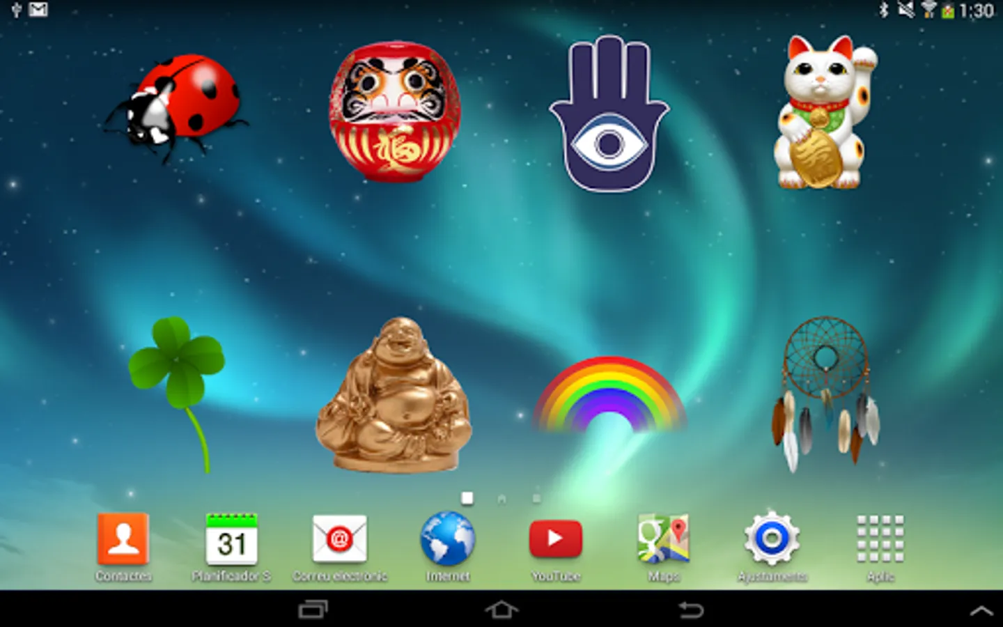 Amulets are the four-leaf clover, ladybug, rainbow, Daruma, Laughing Buddha (Hotei), The hand of fatima (hamsa), the Maneki Neko, the Dreamcatcher, the eye of Horus, a candle, Chinese coins and a shooting star.