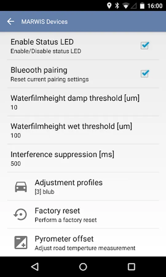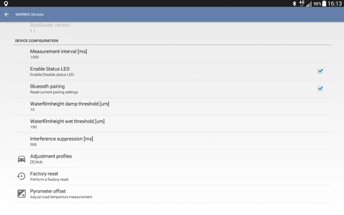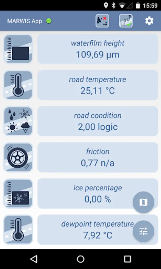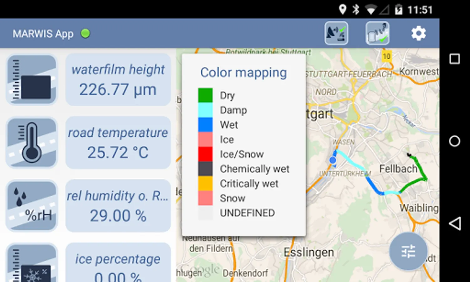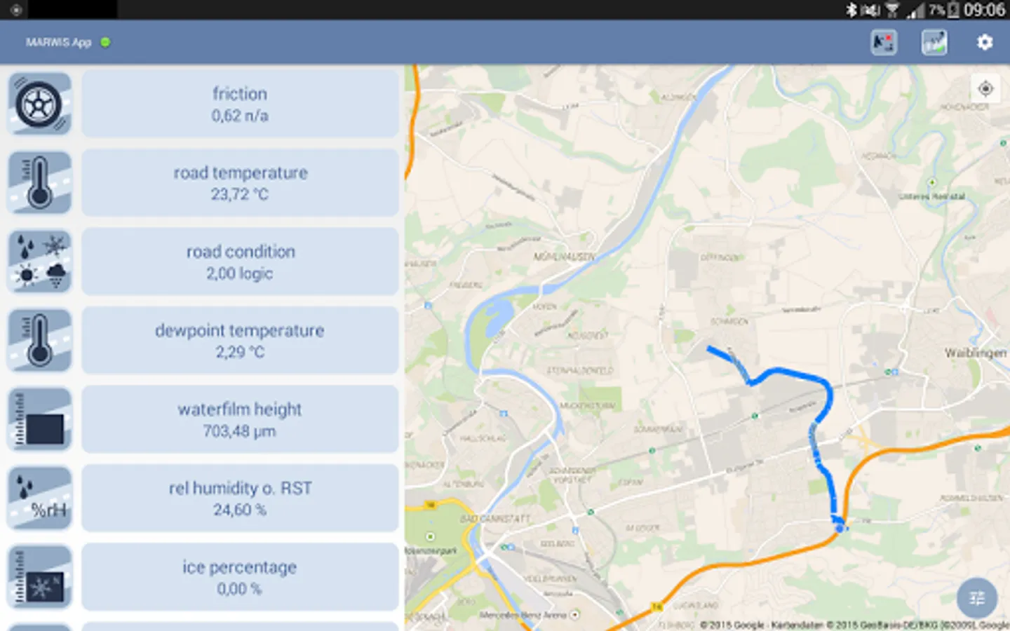 The app for the mobile road-sensor MARWIS-UMB from G. Lufft Mess- und Regeltechnik GmbH allows you to display and transmit location based sensor data like friction, water film height or the road condition.
