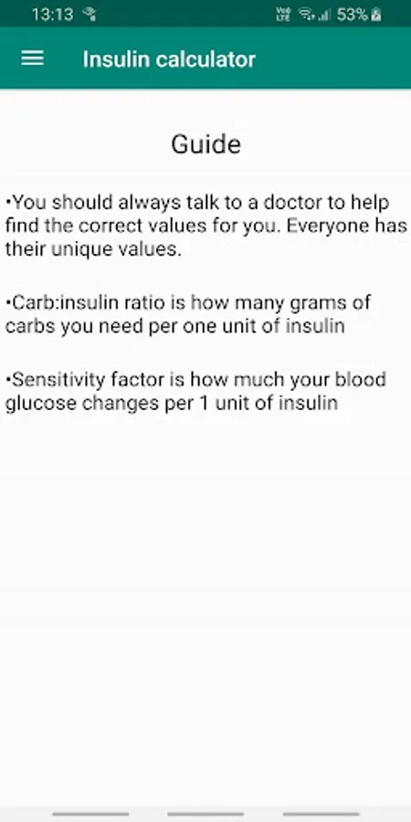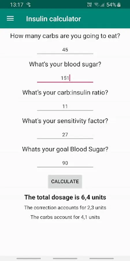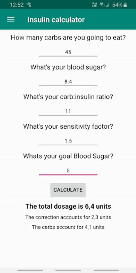 The main tool is the insulin calculator, similar to the Bolus Wizard function you will find in most insulin pumps, that can help you calculate your insulin dose based on your personalized values, your blood glucose level and the amount of carbs you are eating. It works with both mmol/l and mg/dl. The app will store your values locally so you don't have to put them in every time you open it.