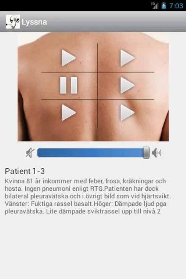Lungappen © currently includes 20 patient cases and all have different symptoms from the lungs, which are outlined in an accompanying medical history. Each patient has three different sound recordings from each lung which means that you can listen to both the lungs and the entire respiratory field. Overall, nearly 120 recordings