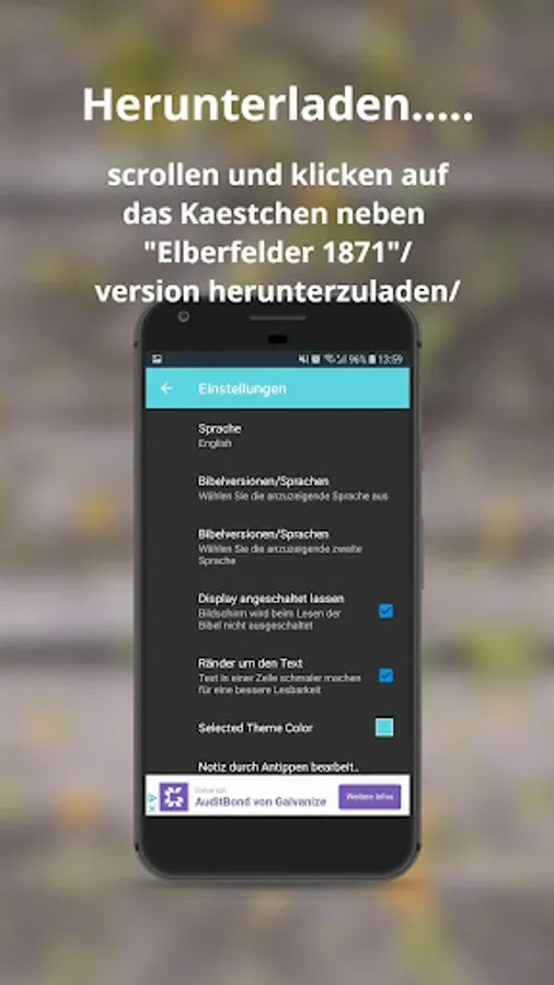 Klicken Sie auf "Einstellungen" / klicken Sie auf "Wählen Sie die anzuzeigende zweite Sprache"/ scrollen Sie nach unten und klicken Sie auf das Kästchen neben "Elberfelder 1871", um die Version herunterzuladen/zur Startseite zurückzukehren.