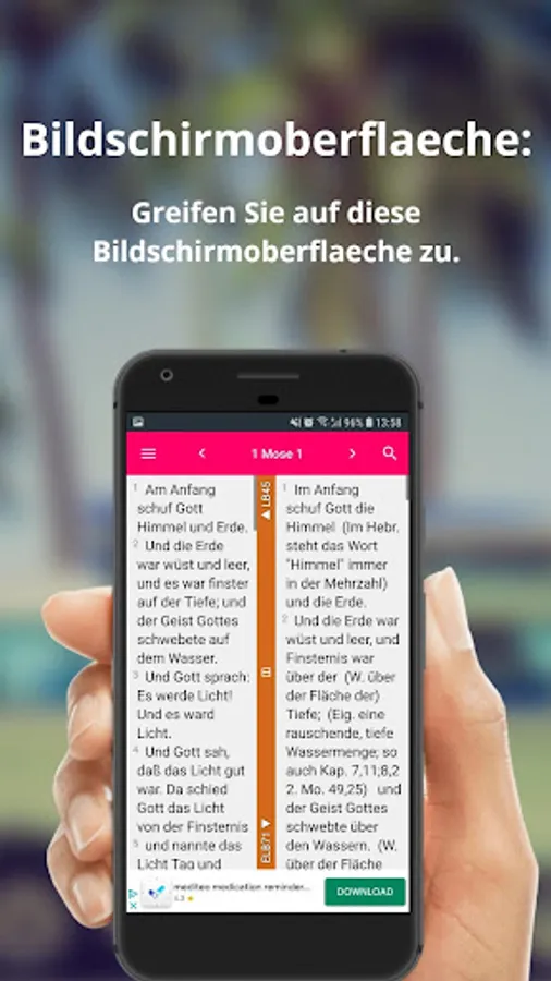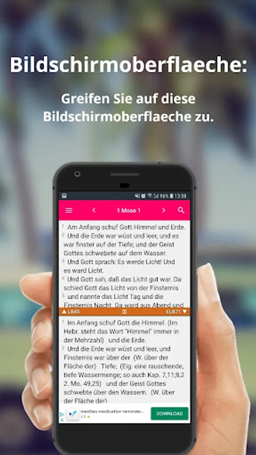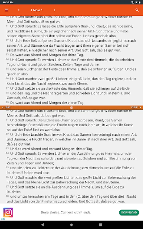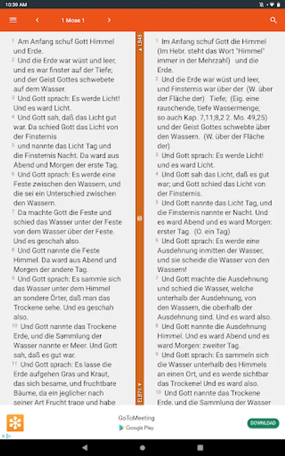 Das Besondere an dieser App ist, dass nach dem Download der Elberfelder-Version Luther- und Elberfelder-Version auf demselben Bildschirm gelesen und vergleichen werden können.