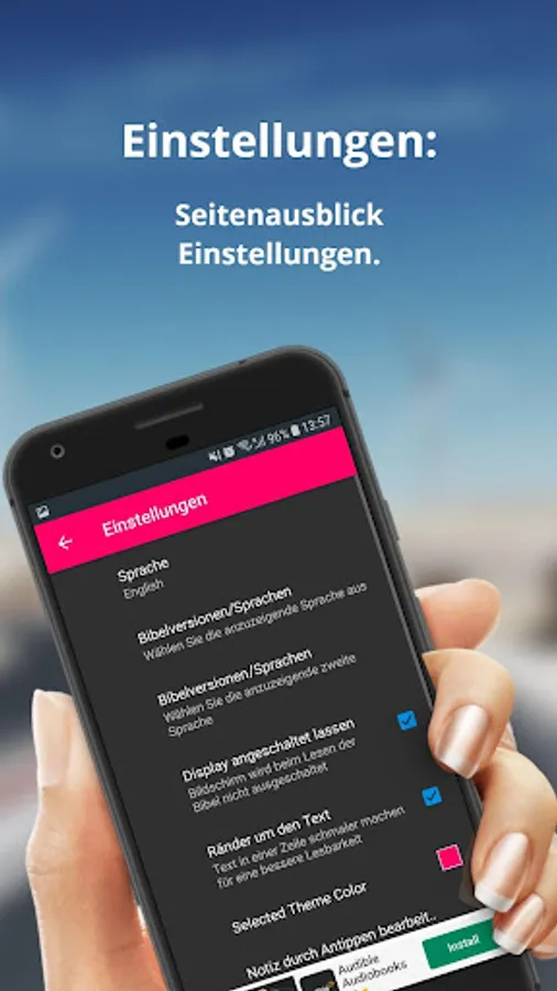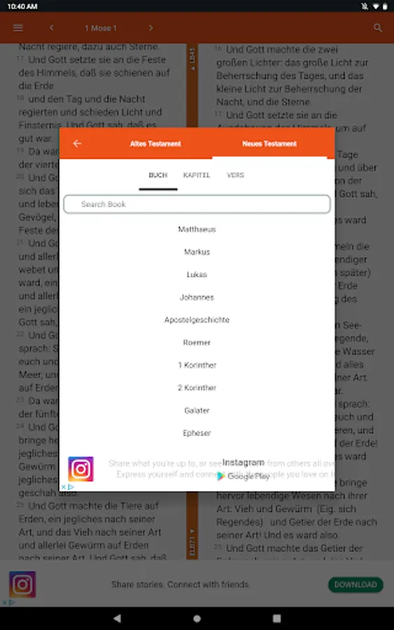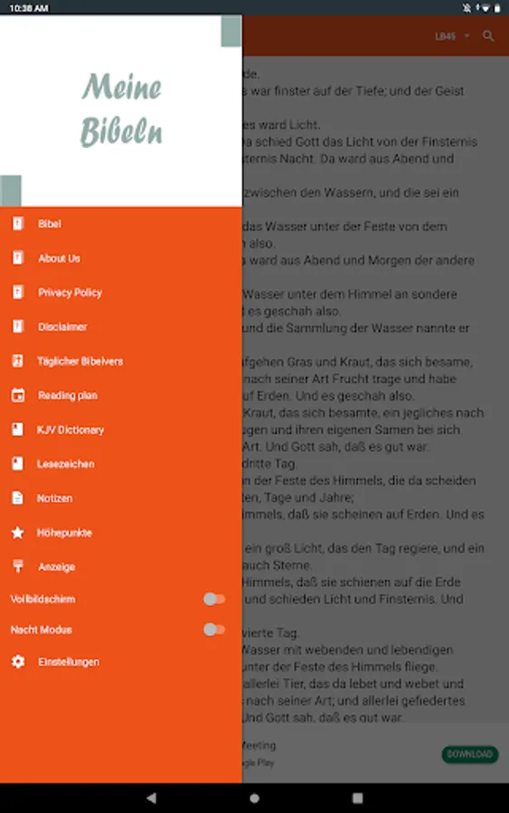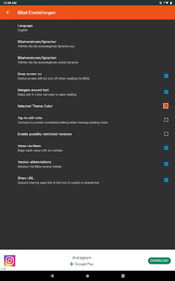 In den Einstellungen kann ein Benutzer viele Funktionen ändern, einschließlich der Themenfarbe und der Bibelversion(en)/Sprache(n). Die folgende ist die Liste der Bücher mit dem Alten und Neuen Testament.