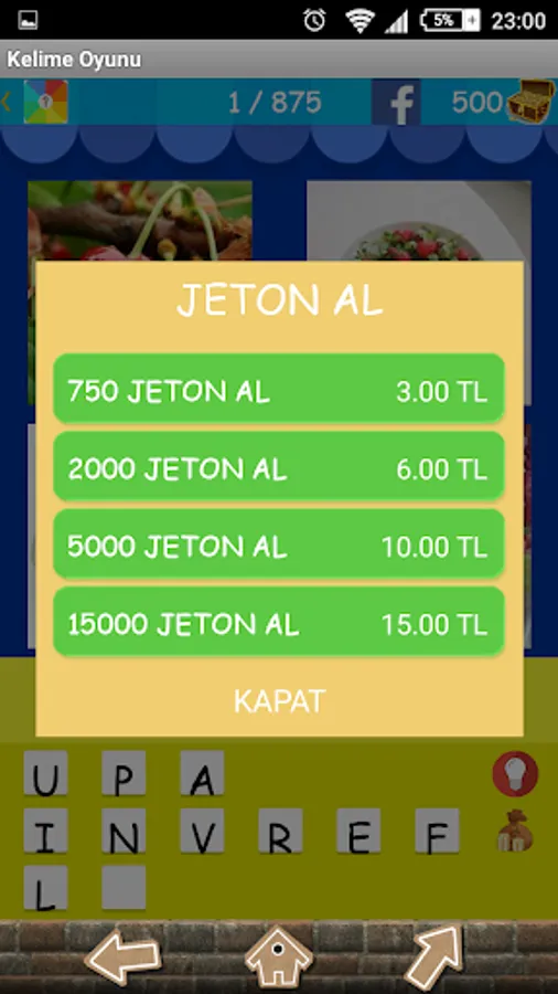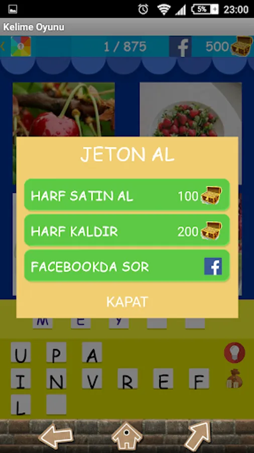 You have several wildcard rights so you can guess the word correctly. When you hang out spots in question to ask you; You can buy letters, you can make elimination of the letters in question. Each right entitles you to answer certain questions that coin, if your coins, you can use a wildcard if you want to exercise your rights wildcard sufficient quantities. If you do not have enough coins, you can buy coins.