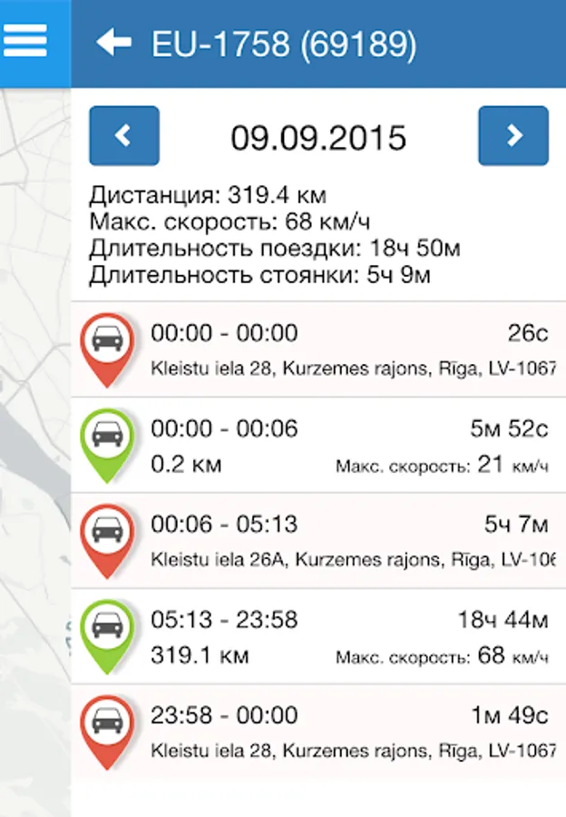 To view vehicle route - go to Routes section in menu, where you can get information about distance, max speed, total trip and stop time and also list of all trips and stops detailed along as full vehicle GPS/Glonass track on map.