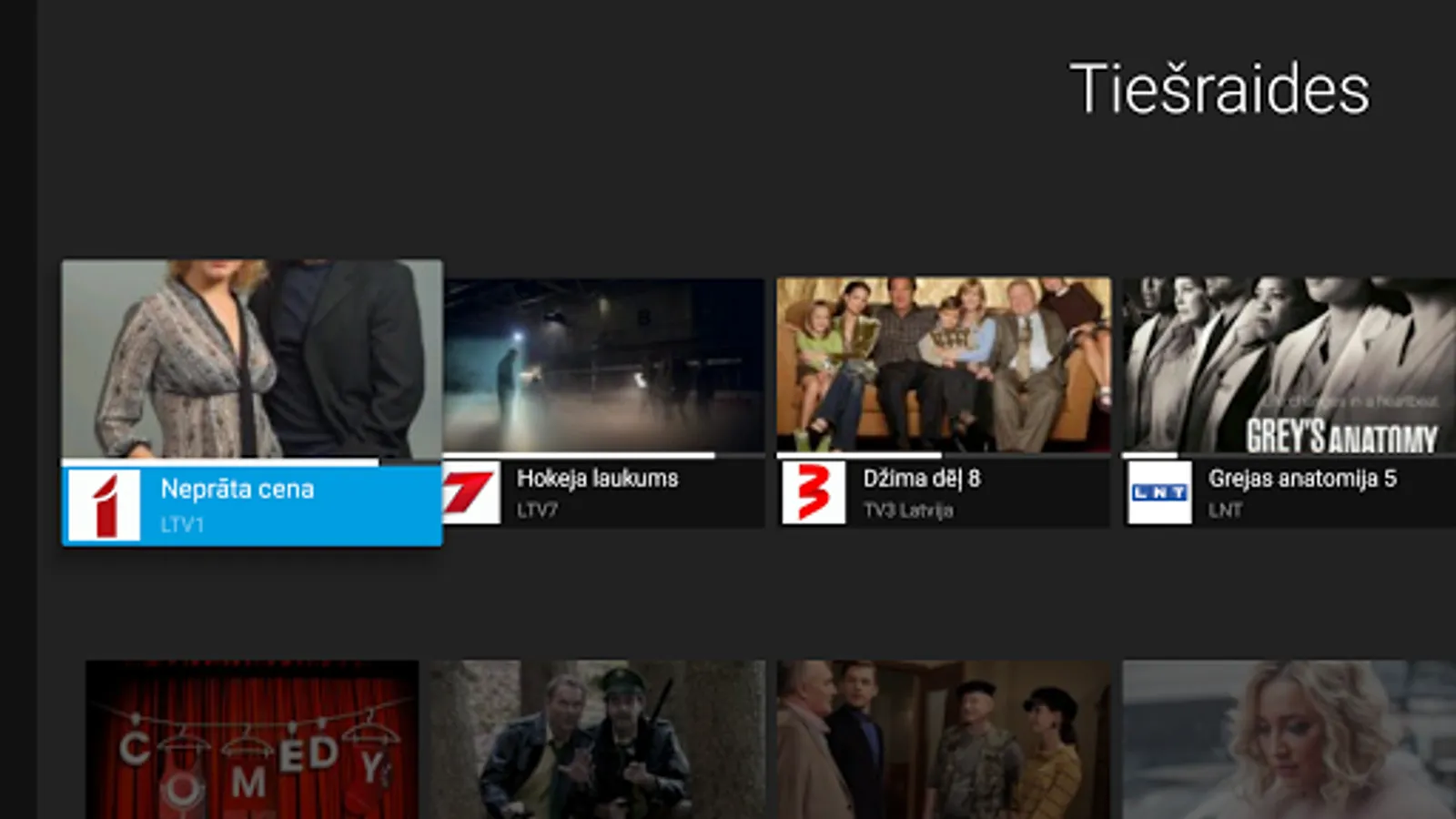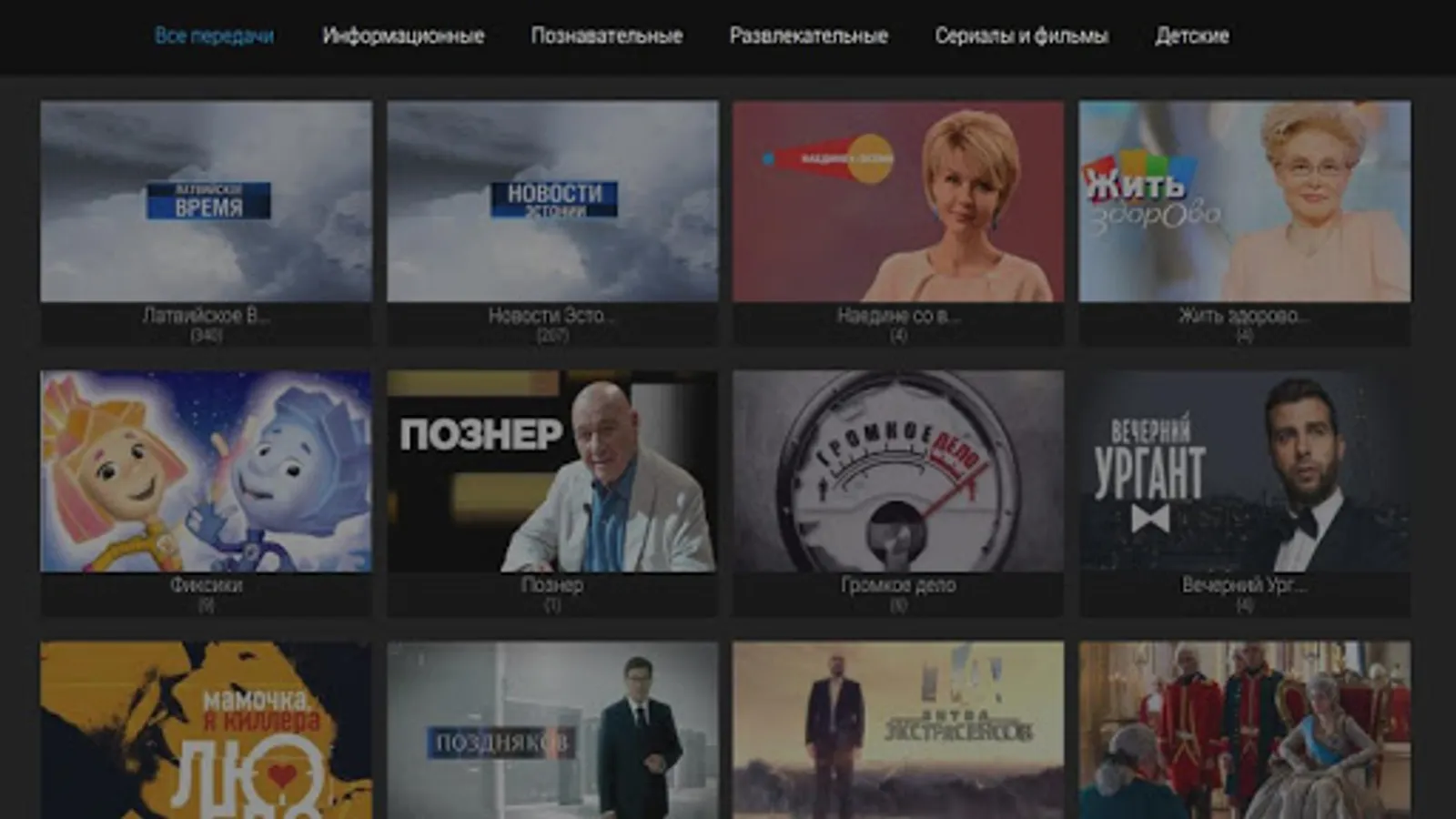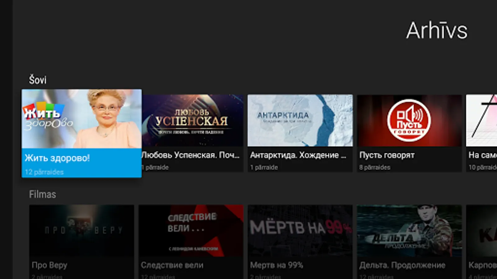 The app offers 15 live TV channels: "First Baltic Channel", "REN TV Baltic", "NTV Mir Baltic", "1st Baltic Music Channel", "Телекафе", "Дом кино", "Карусель", "Время" "Музыка" as well as other TV channels that are popular among the Latvian population. In addition to the available easy-to-use TV program nearest 7 days