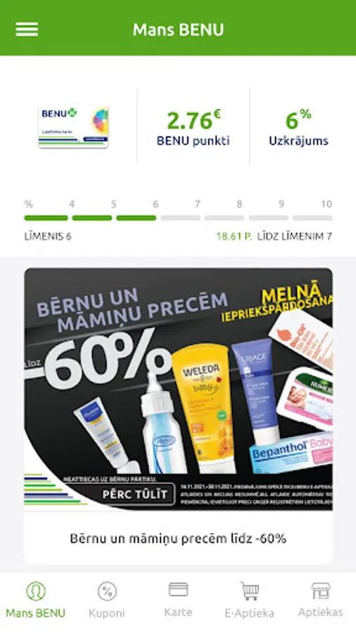 The application allows you to find BENU Pharmacies nearby and to take advantages of ongoing promotions and our personalised offers. Moreover, the application includes BENU loyalty card support and allows you to access the profile of BENU loyalty card holder. You are invited to check the balance of points, follow the tier and loyalty level that you have achieved. In addition, application allows you to view the purchase history in BENU Pharmacies.