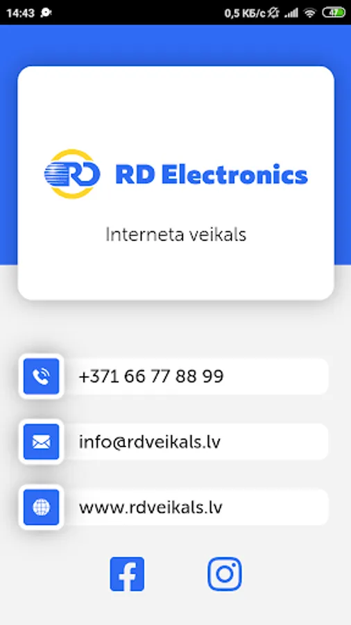 RD Electronics mobilā aplikācija. Aplikācijā Jūs varat iegūt mūsu kontaktu pilno sarakstu. Jūs varēsiet jebkurā momentā sazināties ar mums un mēs atbildēsim uz jebkuru jūsu jautājumu