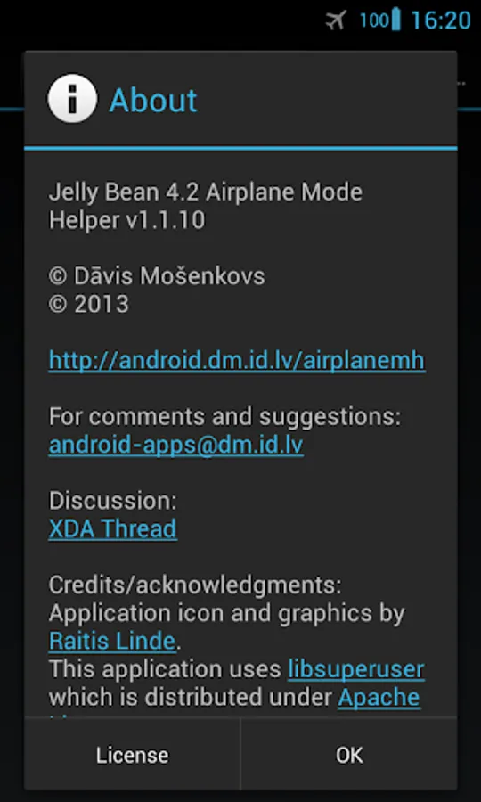 This application allows other applications to control airplane mode on Jelly Bean 4.2 (Android 4.2) devices/ROMs exactly the way it was possible before Android 4.2.