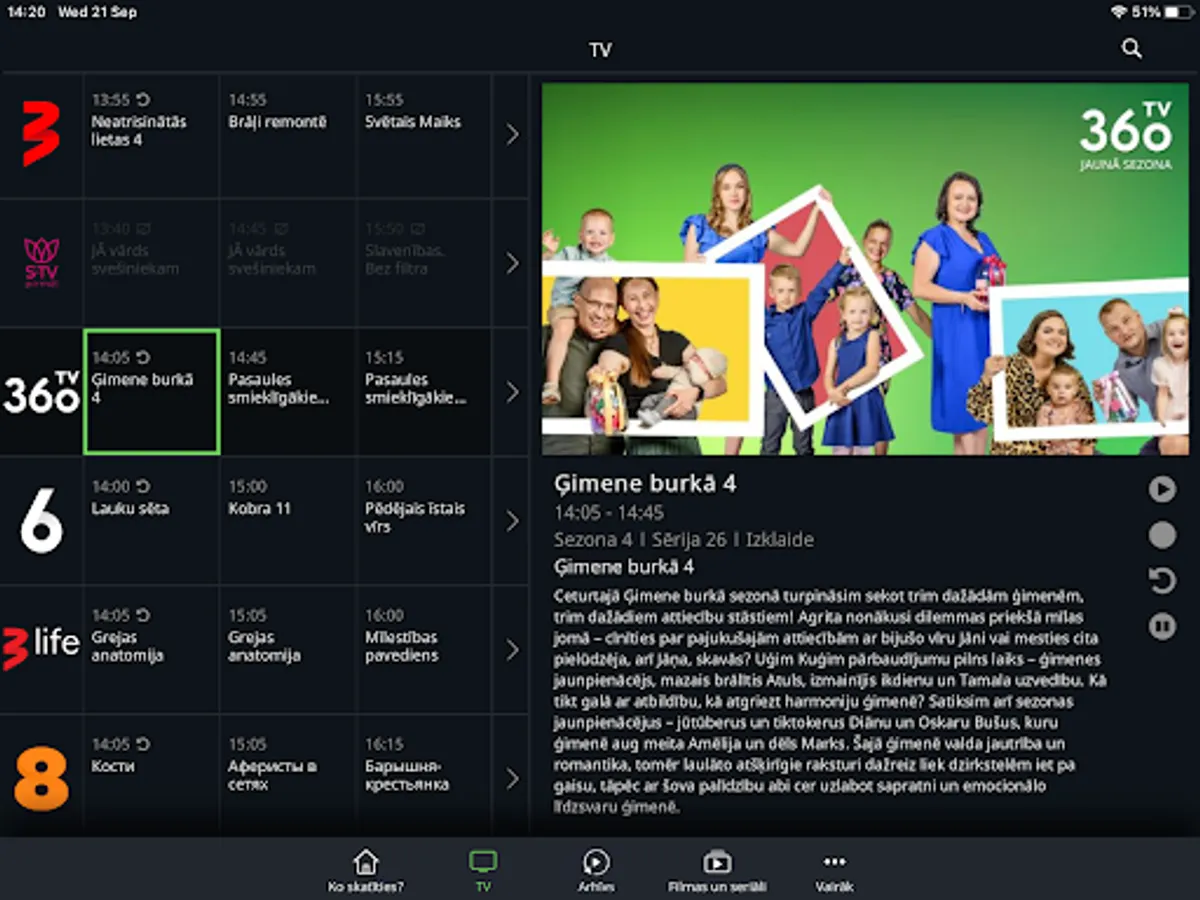 TV archive - if you miss the show, it's okay, because you can watch it in the archive. Find it in the TV program or Archive and start watching at a time and place convenient for you. TV Archive is available for certain channels that have TV Archive and permission from content providers.