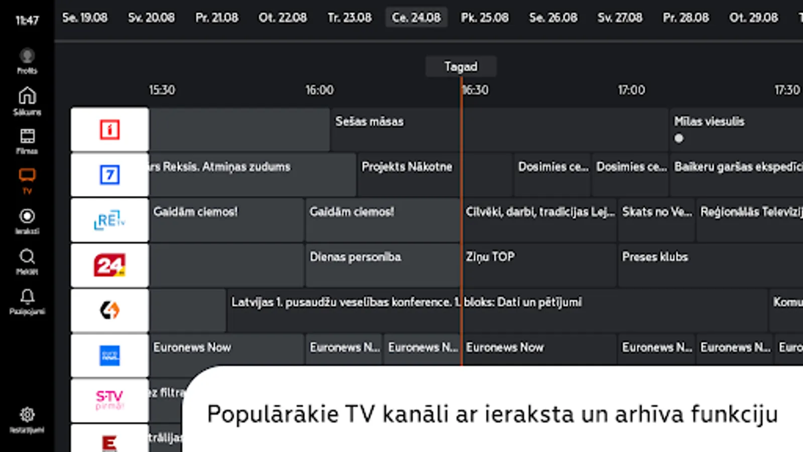 - Latvian and foreign TV channels, TV program, 7-day archive and program recording function. The ability to create your own channel lists, as well as watch content on two devices at the same time.