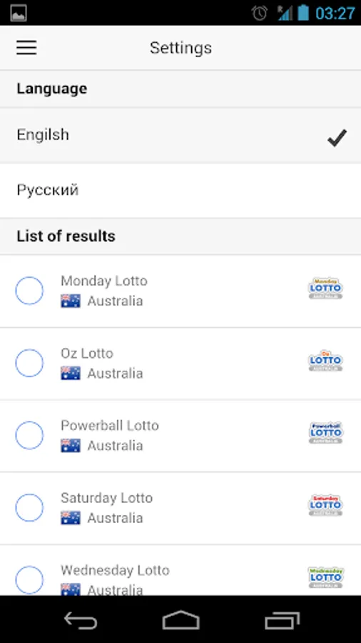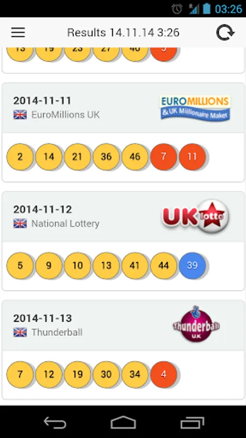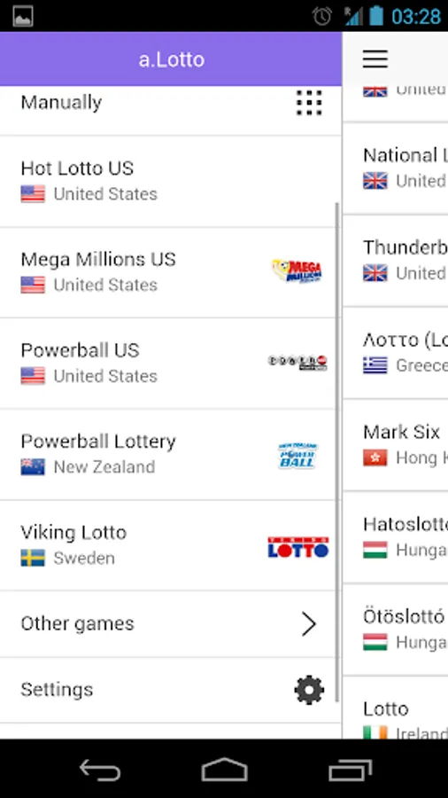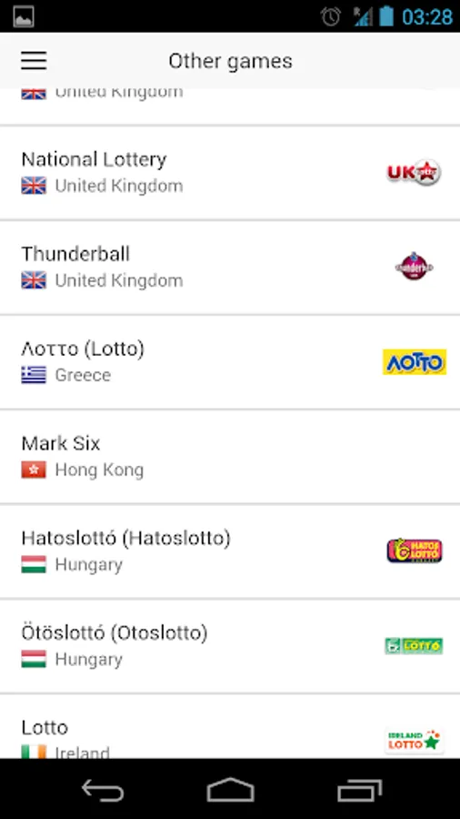 Monday Lotto, Oz Lotto, Powerball Lotto, Saturday Lotto, Wednesday Lotto, Dupla Sena, Mega da Virada, Mega-Sena, Quina, BC 49, Lotto 649, Lotto Max, Quebec 49, Western 6/49, Lottario, Ontario 49, Swiss-Loto, BonoLoto, El Gordo, La Primitiva, EuroJackpot, EuroMillions, Euromillions & My Million Raffle, EuroMillions and UK Millionaire Maker, National Lottery, Thunderball, Λοττο (Lotto), Mark Six, Hatoslottó (Hatoslotto), Ötöslottó (Otoslotto), Double Lotto, New Lotto, SiVinceTutto, SuperEnalotto, SuperStar, Loto 6, LatLoto, Melate, Melate Retro, Powerball Lottery, Lotto 6/49, Гослото 6/45 (Gosloto 6/45), Гослото 7/49 (Gosloto 7/49), Viking Lotto, Super Lotto 6/54, Мегалот (Megalot), Супер Лото (Super Loto), Arizona The Pick, California SuperLotto Plus, Colorado Lotto, Connecticut Lotto!, Florida Lotto, Florida Lucky Money, Florida Mega Money, Illinois Lotto, Indiana Hoosier Lotto, Super Kansas Cash, Louisiana Lotto, Massachusetts Megabucks, Michigan Classic Lotto 47, Missouri Lotto, New Jersey Pick Six, New York Cash4Life, New York Lotto, New York Sweet Million Lotto, Ohio Classic Lotto, Oregon Megabucks, Hot Lotto US, Mega Millions US, Powerball US, Vermont Megabucks Plus, Washington Lotto, Wisconsin Megabucks