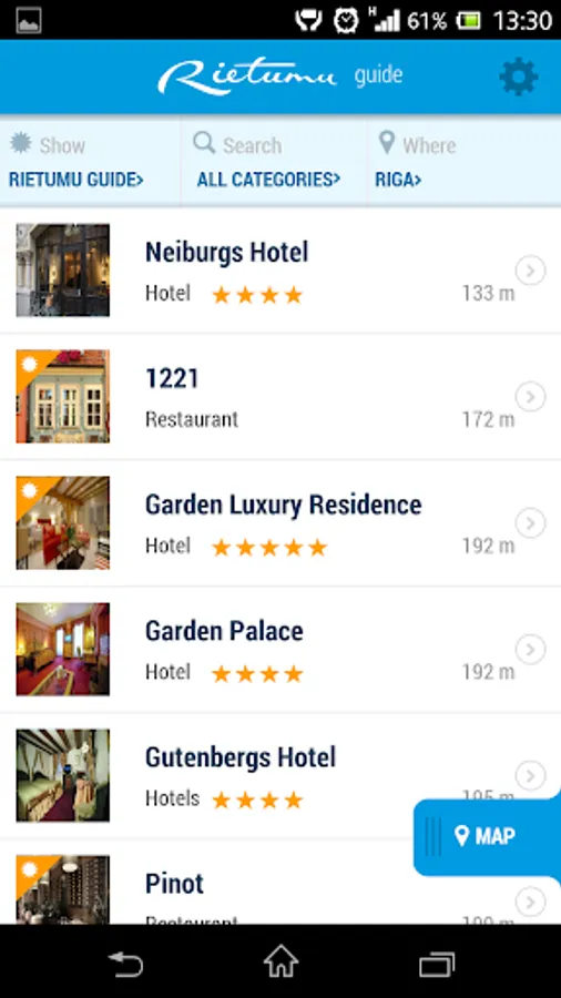 Rietumu Guide contains carefully selected restaurants, hotels, exhibition halls and must-see locations for day-trips.