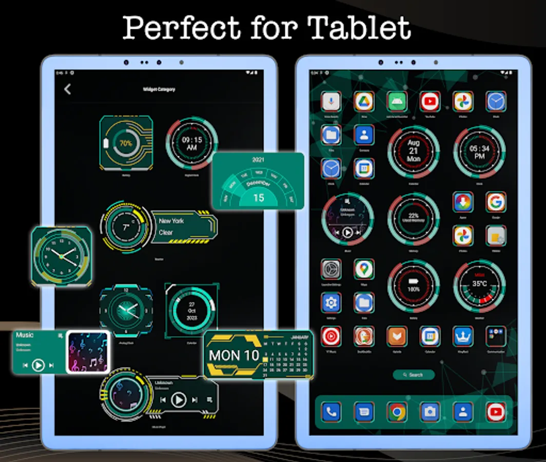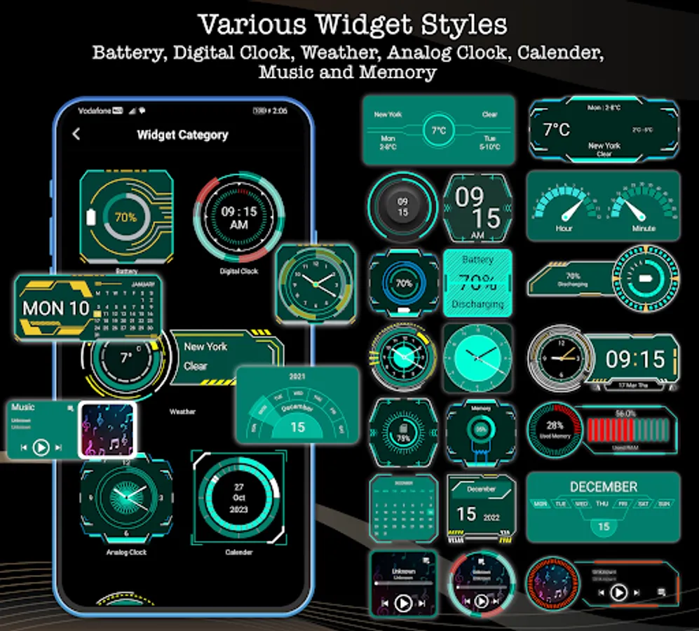 Nextron Launcher 2023 offers a variety of useful widgets, including Battery, digital clock, weather, analog clock, calender, music and memory widgets providing quick access to essential information.